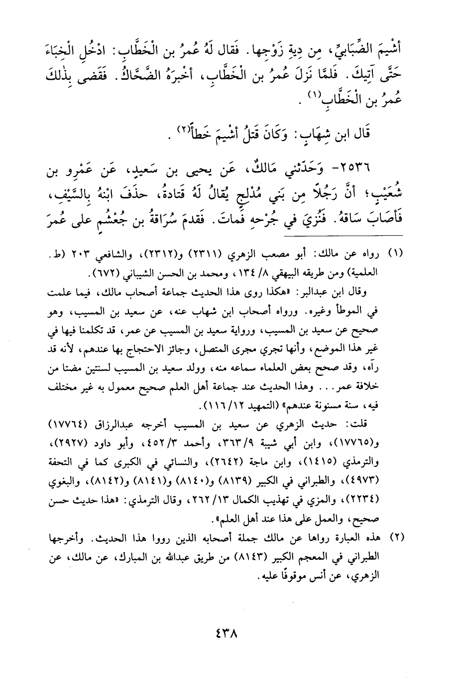 2536- وَحَدَّثَنِي مَالِكٌ، عَنْ يَحْيَى بْنِ سَعِيدٍ، عَنْ عَمْرِو بْنِ شُعَيْبٍ، أَنَّ رَجُلاً مِنْ بَنِي مُدْلِجٍ، يُقَالُ لَهُ: قَتَادَةُ، حَذَفَ ابْنَهُ بِالسَّيْفِ، فَأَصَابَ سَاقَهُ، فَنُزِيَ فِي جُرْحِهِ، فَمَاتَ، فَقَدِمَ سُرَاقَةُ بْنُ جُعْشُمٍ عَلَى عُمَرَ بْنِ الْخَطَّابِ، فَذَكَرَ ذَلِكَ لَهُ، فَقَالَ لَهُ عُمَرُ: اعْدُدْ عَلَى مَاءِ قُدَيْدٍ عِشْرِينَ وَمِئَةَ بَعِيرٍ حَتَّى أَقْدَمَ عَلَيْكَ، فَلَمَّا قَدِمَ إِلَيْهِ عُمَرُ بْنُ الْخَطَّابِ، أَخَذَ مِنْ تِلْكَ الإِبِلِ ثَلاَثِينَ حِقَّةً، وَثَلاَثِينَ جَذَعَةً، وَأَرْبَعِينَ خَلِفَةً، ثُمَّ قَالَ: أَيْنَ أَخُو الْمَقْتُولِ؟ قَالَ: هَأَنَذَا، قَالَ: خُذْهَا، فَإِنَّ رَسُولَ اللهِ صَلى الله عَلَيهِ وَسَلمَ قَالَ: لَيْسَ لِقَاتِلٍ شَيْءٌ.