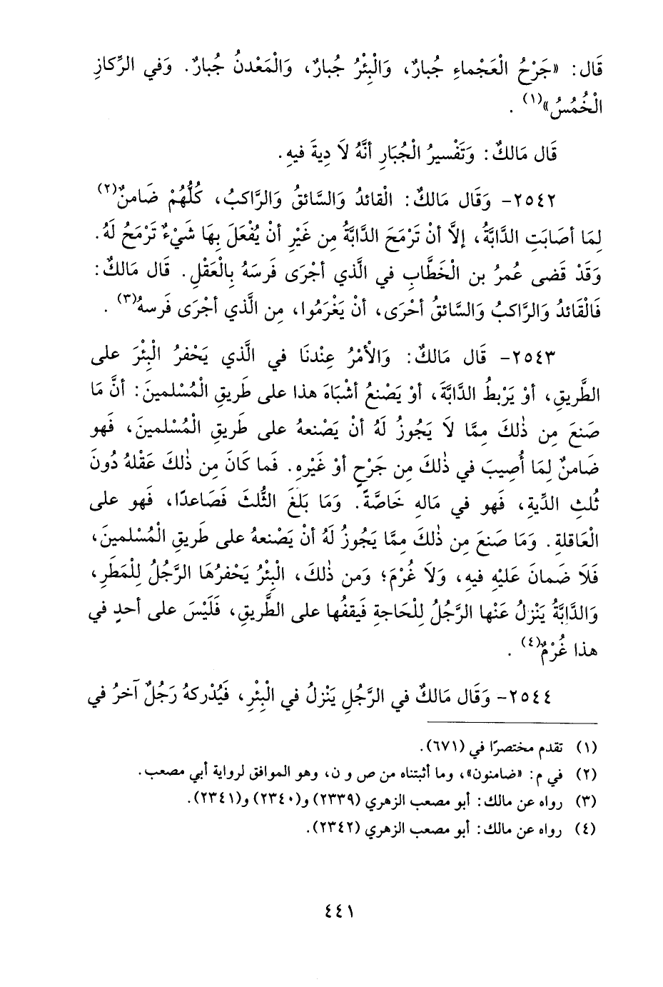 2542- وَقَالَ مَالِكٌ: الْقَائِدُ وَالسَّائِقُ وَالرَّاكِبُ كُلُّهُمْ ضَامِنٌ لِمَا أَصَابَتِ الدَّابَّةُ، إِلاَّ أَنْ تَرْمَحَ الدَّابَّةُ مِنْ غَيْرِ أَنْ يُفْعَلَ بِهَا شَيْءٌ تَرْمَحُ لَهُ، وَقَدْ قَضَى عُمَرُ بْنُ الْخَطَّابِ فِي الَّذِي أَجْرَى فَرَسَهُ بِالْعَقْلِ.