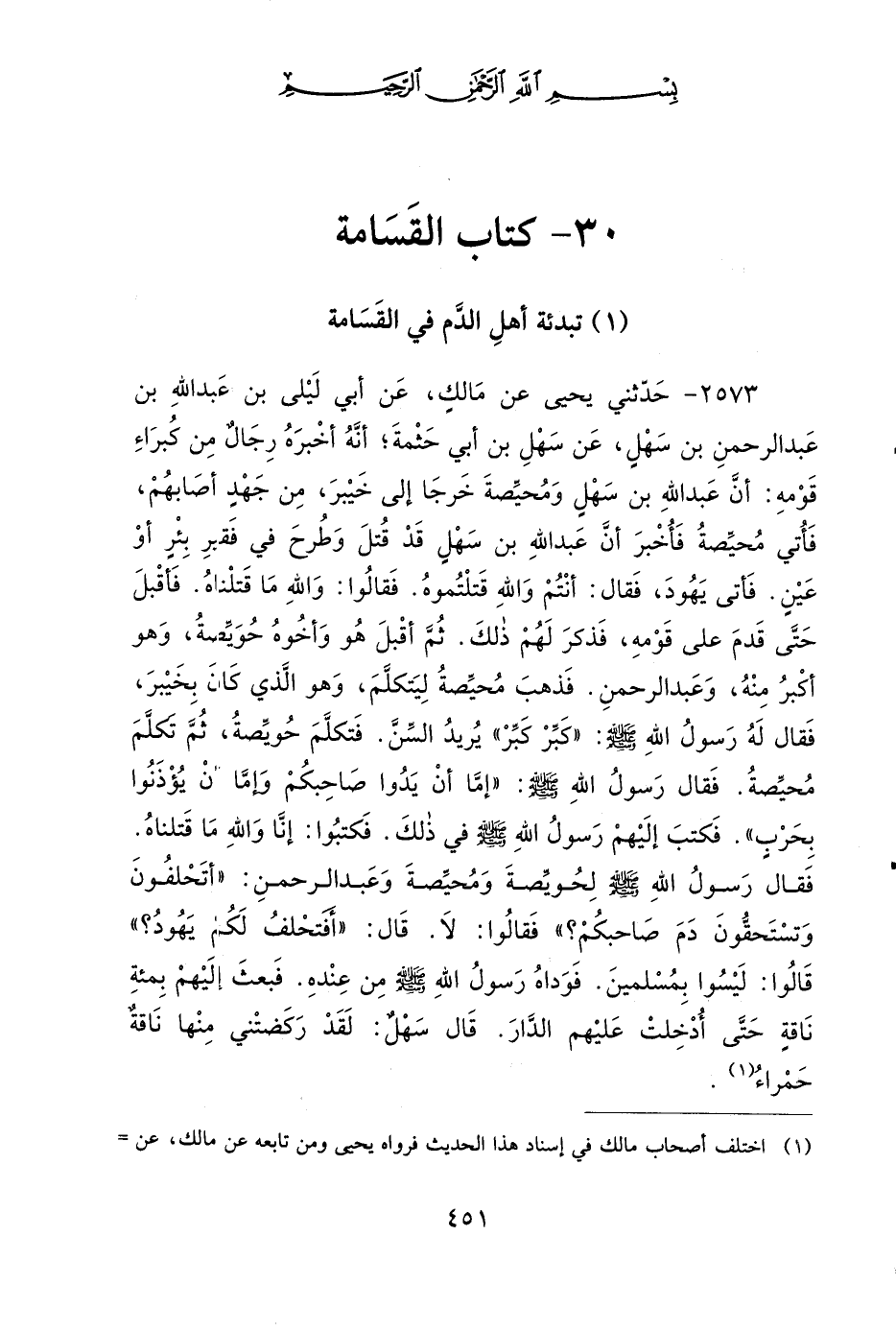 2573 - حَدَّثَنِي يَحْيَى، عَنْ مَالِكٍ، عَنْ أَبِي لَيْلَى بْنِ عَبْدِ اللهِ بْنِ عَبْدِ الرَّحْمَنِ بْنِ سَهْلٍ، عَنْ سَهْلِ بْنِ أَبِي حَثْمَةَ، أَنَّهُ أَخْبَرَهُ رِجَالٌ مِنْ كُبَرَاءِ قَوْمِهِ، أَنَّ عَبْدَ اللهِ بْنَ سَهْلٍ وَمُحَيِّصَةَ خَرَجَا إِلَى خَيْبَرَ مِنْ جَهْدٍ أَصَابَهُمْ، فَأُتِيَ مُحَيِّصَةُ، فَأُخْبِرَ أَنَّ عَبْدَ اللهِ بْنَ سَهْلٍ قَدْ قُتِلَ وَطُرِحَ فِي فَقِيرِ بِئْرٍ أَوْ عَيْنٍ، فَأَتَى يَهُودَ، فَقَالَ: أَنْتُمْ وَاللَّهِ قَتَلْتُمُوهُ، فَقَالُوا: وَاللَّهِ مَا قَتَلْنَاهُ، فَأَقْبَلَ حَتَّى قَدِمَ عَلَى قَوْمِهِ، فَذَكَرَ لَهُمْ ذَلِكَ، ثُمَّ أَقْبَلَ هُوَ وَأَخُوهُ حُوَيِّصَةُ، وَهُوَ أَكْبَرُ مِنْهُ، وَعَبْدُ الرَّحْمَنِ، فَذَهَبَ مُحَيِّصَةُ لِيَتَكَلَّمَ، وَهُوَ الَّذِي كَانَ بِخَيْبَرَ، فَقَالَ لَهُ رَسُولُ اللهِ صَلى الله عَلَيهِ وَسَلمَ: كَبِّرْ كَبِّرْ،، يُرِيدُ السِّنَّ، فَتَكَلَّمَ حُوَيِّصَةُ، ثُمَّ تَكَلَّمَ مُحَيِّصَةُ، فَقَالَ رَسُولُ اللهِ صَلى الله عَلَيهِ وَسَلمَ: إِمَّا أَنْ يَدُوا صَاحِبَكُمْ، وَإِمَّا أَنْ يُؤْذِنُوا بِحَرْبٍ، فَكَتَبَ إِلَيْهِمْ رَسُولُ اللهِ صَلى الله عَلَيهِ وَسَلمَ فِي ذَلِكَ، فَكَتَبُوا: إِنَّا وَاللَّهِ مَا قَتَلْنَاهُ، فَقَالَ رَسُولُ اللهِ صَلى الله عَلَيهِ وَسَلمَ لِحُوَيِّصَةَ، وَمُحَيِّصَةَ، وَعَبْدِ الرَّحْمَنِ: أَتَحْلِفُونَ وَتَسْتَحِقُّونَ دَمَ صَاحِبِكُمْ؟ فَقَالُوا: لاَ، قَالَ: أَفَتَحْلِفُ لَكُمْ يَهُودُ؟ قَالُوا: لَيْسُوا بِمُسْلِمِينَ، فَوَدَاهُ رَسُولُ اللهِ صَلى الله عَلَيهِ وَسَلمَ مِنْ عِنْدِهِ، فَبَعَثَ إِلَيْهِمْ بِمِئَةِ نَاقَةٍ حَتَّى أُدْخِلَتْ عَلَيْهِمُ الدَّارَ، قَالَ سَهْلٌ: لَقَدْ رَكَضَتْنِي مِنْهَا نَاقَةٌ حَمْرَاءُ.
