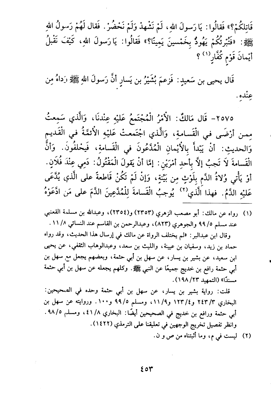 2575- قَالَ مَالِكٌ: الأَمْرُ الْمُجْتَمَعُ عَلَيْهِ عِنْدَنَا، وَالَّذِي سَمِعْتُ مِمَّنْ أَرْضَى فِي الْقَسَامَةِ، وَالَّذِي اجْتَمَعَتْ عَلَيْهِ الأَئِمَّةُ فِي الْقَدِيمِ وَالْحَدِيثِ: أَنْ يَبْدَأَ بِالأَيْمَانِ الْمُدَّعُونَ فِي الْقَسَامَةِ فَيَحْلِفُونَ، وَأَنَّ الْقَسَامَةَ لاَ تَجِبُ إِلاَّ بِأَحَدِ أَمْرَيْنِ، إِمَّا أَنْ يَقُولَ الْمَقْتُولُ: دَمِي عِنْدَ فُلاَنٍ، أَوْ يَأْتِيَ وُلاَةُ الدَّمِ بِلَوْثٍ مِنْ بَيِّنَةٍ، وَإِنْ لَمْ تَكُنْ قَاطِعَةً عَلَى الَّذِي يُدَّعَى عَلَيْهِ الدَّمُ، فَهَذَا الَّذِي يُوجِبُ الْقَسَامَةَ لِلْمُدَّعِينَ الدَّمَ عَلَى مَنِ ادَّعَوْهُ عَلَيْهِ، وَلاَ تَجِبُ الْقَسَامَةُ عِنْدَنَا إِلاَّ بِأَحَدِ هَذَيْنِ الْوَجْهَيْنِ.