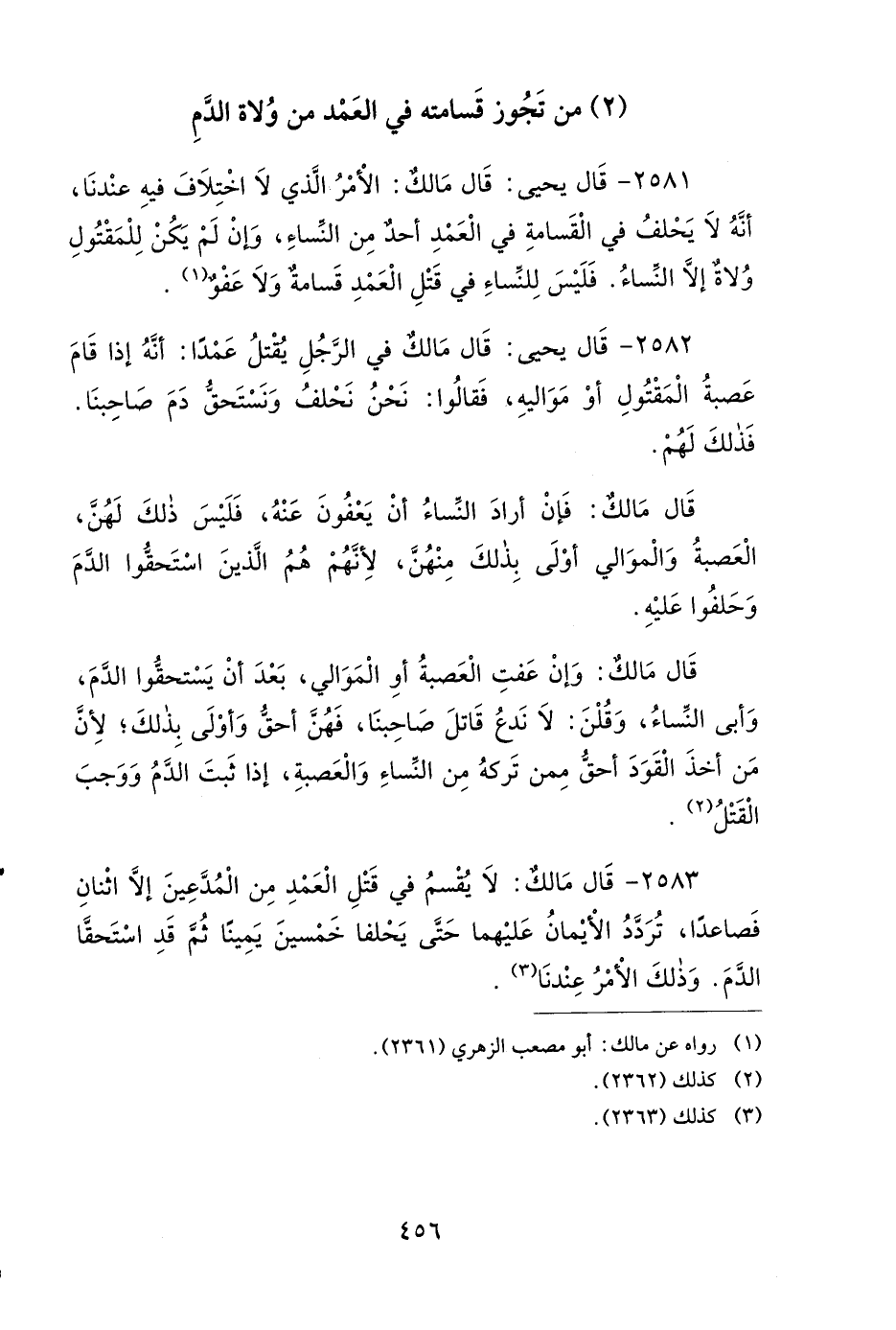 2581- قَالَ يَحْيَى: قَالَ مَالِكٌ: الأَمْرُ الَّذِي لاَ اخْتِلاَفَ فِيهِ عِنْدَنَا، أَنَّهُ لاَ يَحْلِفُ فِي الْقَسَامَةِ فِي الْعَمْدِ أَحَدٌ مِنَ النِّسَاءِ، وَإِنْ لَمْ يَكُنْ لِلْمَقْتُولِ وُلاَةٌ إِلاَّ النِّسَاءُ، فَلَيْسَ لِلنِّسَاءِ فِي قَتْلِ الْعَمْدِ قَسَامَةٌ وَلاَ عَفْوٌ.