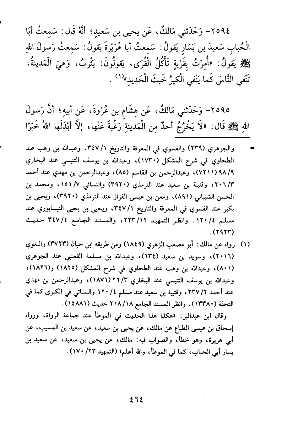 2594 - وَحَدَّثَنِي مَالِكٌ، عَنْ يَحْيَى بْنِ سَعِيدٍ، أَنَّهُ قَالَ: سَمِعْتُ أَبَا الْحُبَابِ سَعِيدَ بْنَ يَسَارٍ يَقُولُ: سَمِعْتُ أَبَا هُرَيْرَةَ يَقُولُ: سَمِعْتُ رَسُولَ اللهِ صَلى الله عَلَيهِ وَسَلمَ يَقُولُ: أُمِرْتُ بِقَرْيَةٍ تَأْكُلُ الْقُرَى، يَقُولُونَ: يَثْرِبُ، وَهِيَ الْمَدِينَةُ، تَنْفِي النَّاسَ كَمَا يَنْفِي الْكِيرُ خَبَثَ الْحَدِيدِ.