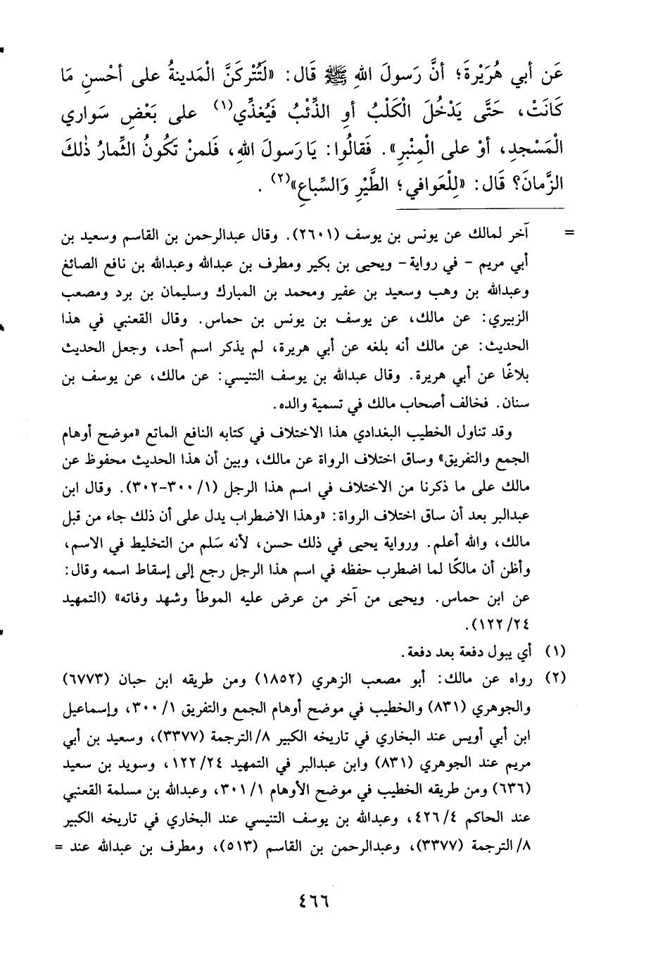 2597 - حَدَّثَنِي يَحْيَى، عَنْ مَالِكٍ، عَنِ ابْنِ حِمَاسٍ، عَنْ عَمِّهِ، عَنْ أَبِي هُرَيْرَةَ، أَنَّ رَسُولَ اللهِ صَلى الله عَلَيهِ وَسَلمَ قَالَ: لَتُتْرَكَنَّ الْمَدِينَةُ عَلَى أَحْسَنِ مَا كَانَتْ، حَتَّى يَدْخُلَ الْكَلْبُ أَوِ الذِّئْبُ، فَيُغَذِّي عَلَى بَعْضِ سَوَارِي الْمَسْجِدِ أَوْ عَلَى الْمِنْبَرِ، فَقَالُوا: يَا رَسُولَ اللهِ، فَلِمَنْ تَكُونُ الثِّمَارُ ذَلِكَ الزَّمَانَ؟ قَالَ: لِلْعَوَافِي: الطَّيْرِ وَالسِّبَاعِ.