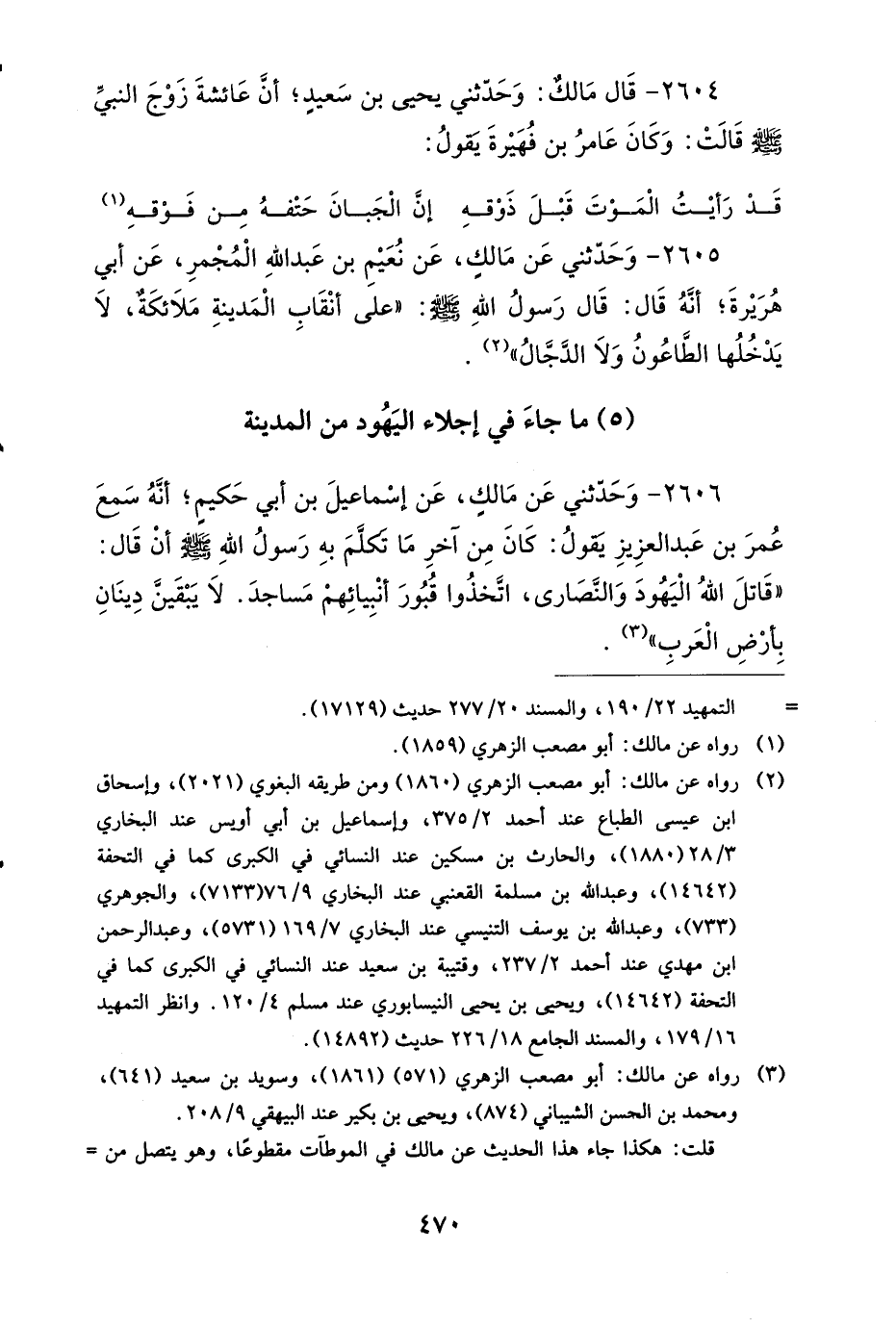 2605 - وَحَدَّثَنِي عَنْ مَالِكٍ، عَنْ نُعَيْمِ بْنِ عَبْدِ اللهِ الْمُجْمِرِ، عَنْ أَبِي هُرَيْرَةَ، أَنَّهُ قَالَ: قَالَ رَسُولُ اللهِ صَلى الله عَلَيهِ وَسَلمَ: عَلَى أَنْقَابِ الْمَدِينَةِ مَلاَئِكَةٌ، لاَ يَدْخُلُهَا الطَّاعُونُ، وَلاَ الدَّجَّالُ.
