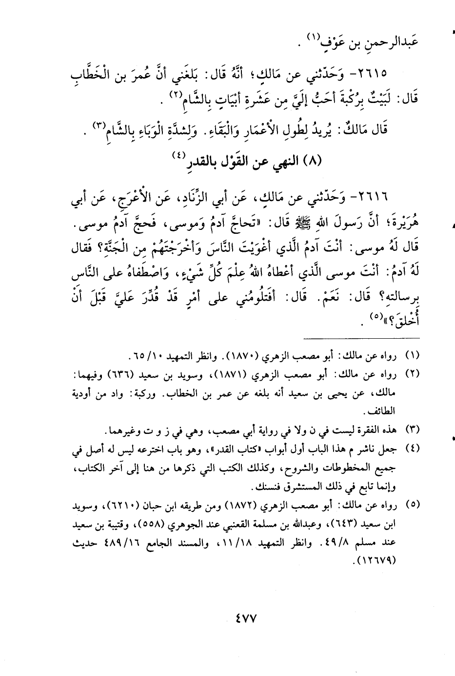 2616 - وَحَدَّثَنِي عَنْ مَالِكٍ، عَنْ أَبِي الزِّنَادِ، عَنِ الأَعْرَجِ، عَنْ أَبِي هُرَيْرَةَ، أَنَّ رَسُولَ اللهِ صَلى الله عَلَيهِ وَسَلمَ قَالَ: تَحَاجَّ آدَمُ وَمُوسَى، فَحَجَّ آدَمُ مُوسَى، قَالَ لَهُ مُوسَى: أَنْتَ آدَمُ الَّذِي أَغْوَيْتَ النَّاسَ، وَأَخْرَجْتَهُمْ مِنَ الْجَنَّةِ؟ فَقَالَ لَهُ آدَمُ: أَنْتَ مُوسَى الَّذِي أَعْطَاهُ اللهُ عِلْمَ كُلِّ شَيْءٍ، وَاصْطَفَاهُ عَلَى النَّاسِ بِرِسَالَتِهِ؟ قَالَ: نَعَمْ، قَالَ: أَفَتَلُومُنِي عَلَى أَمْرٍ قَدْ قُدِّرَ عَلَيَّ قَبْلَ أَنْ أُخْلَقَ.