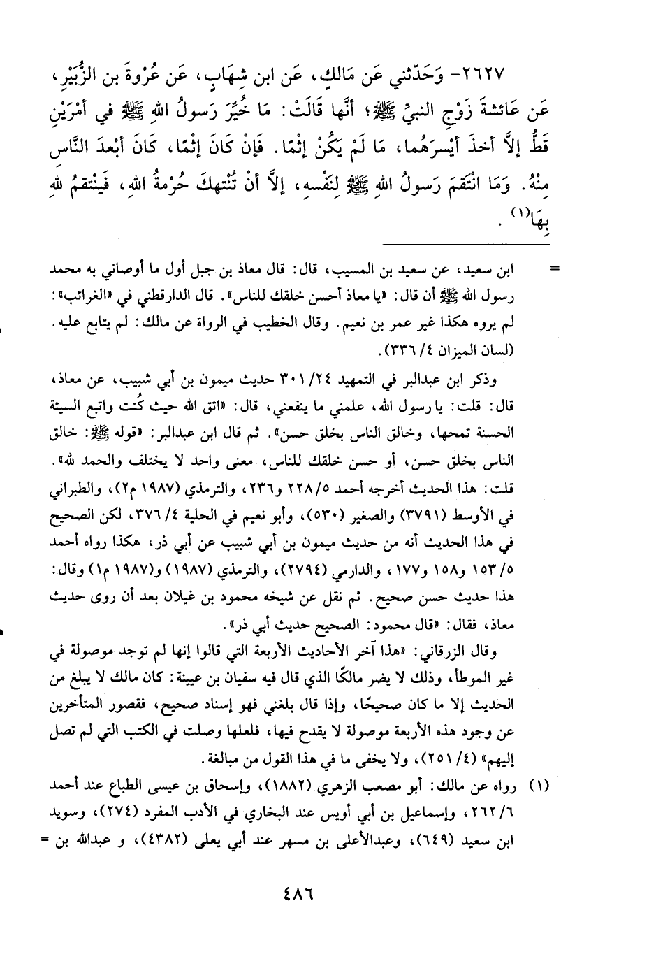 2627 - وَحَدَّثَنِي عَنْ مَالِكٍ، عَنِ ابْنِ شِهَابٍ، عَنْ عُرْوَةَ بْنِ الزُّبَيْرِ، عَنْ عَائِشَةَ، زَوْجِ النَّبِيِّ صَلى الله عَلَيهِ وَسَلمَ، أَنَّهَا قَالَتْ: مَا خُيِّرَ رَسُولُ اللهِ صَلى الله عَلَيهِ وَسَلمَ فِي أَمْرَيْنِ قَطُّ إِلاَّ أَخَذَ أَيْسَرَهُمَا، مَا لَمْ يَكُنْ إِثْمًا، فَإِنْ كَانَ إِثْمًا، كَانَ أَبْعَدَ النَّاسِ مِنْهُ، وَمَا انْتَقَمَ رَسُولُ اللهِ صَلى الله عَلَيهِ وَسَلمَ لِنَفْسِهِ، إِلاَّ أَنْ تُنْتَهَكَ حُرْمَةُ اللهِ، فَيَنْتَقِمُ لِلَّهِ بِهَا.