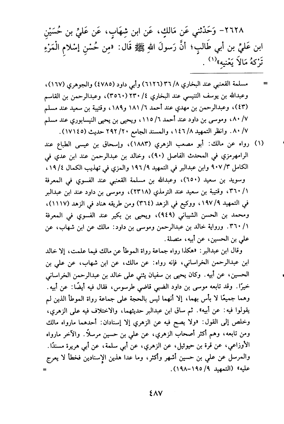 2628 - وَحَدَّثَنِي عَنْ مَالِكٍ، عَنِ ابْنِ شِهَابٍ، عَنْ عَلِيِّ بْنِ حُسَيْنِ بْنِ عَلِيِّ بْنِ أَبِي طَالِبٍ، أَنَّ رَسُولَ اللهِ صَلى الله عَلَيهِ وَسَلمَ قَالَ: مِنْ حُسْنِ إِسْلاَمِ الْمَرْءِ، تَرْكُهُ مَا لاَ يَعْنِيهِ.