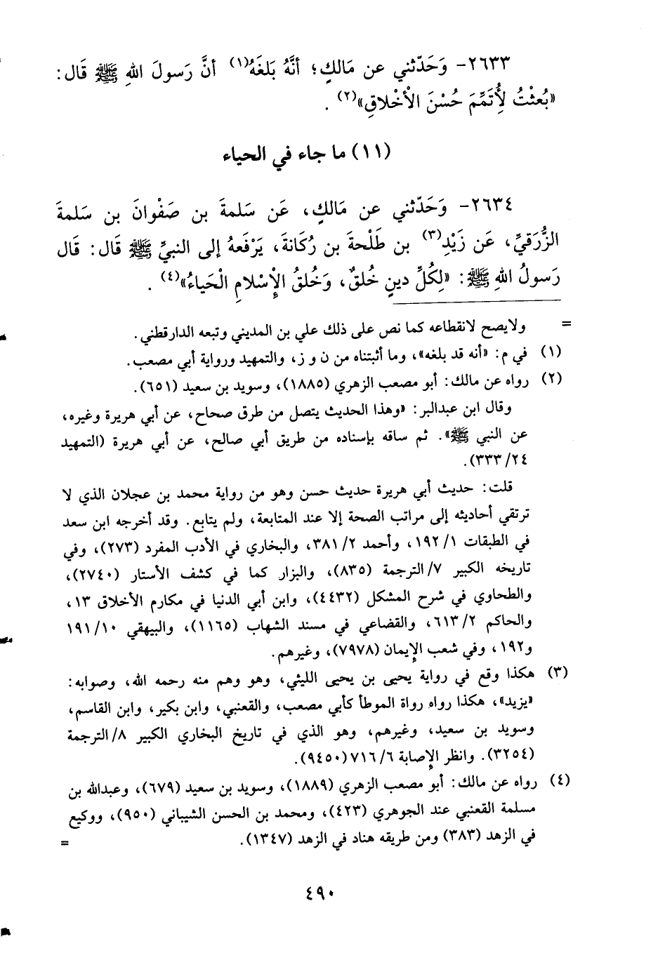2634 - وَحَدَّثَنِي عَنْ مَالِكٍ، عَنْ سَلَمَةَ بْنِ صَفْوَانَ بْنِ سَلَمَةَ الزُّرَقِيِّ، عَنْ زَيْدِ (1) بْنِ طَلْحَةَ بْنِ رُكَانَةَ، يَرْفَعُهُ إِلَى النَّبِيِّ صَلى الله عَلَيهِ وَسَلمَ قَالَ: قَالَ رَسُولُ اللهِ صَلى الله عَلَيهِ وَسَلمَ: لِكُلِّ دِينٍ خُلُقٌ، وَخُلُقُ الإِسْلاَمِ الْحَيَاءُ.