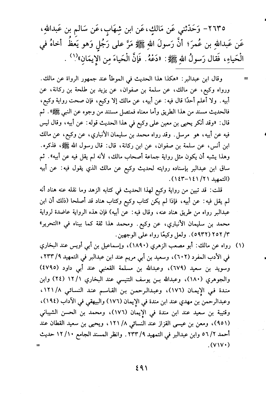 2635 - وَحَدَّثَنِي عَنْ مَالِكٍ، عَنِ ابْنِ شِهَابٍ، عَنْ سَالِمِ بْنِ عَبْدِ اللهِ، عَنْ عَبْدِ اللهِ بْنِ عُمَرَ؛ أَنَّ رَسُولَ اللهِ صَلى الله عَلَيهِ وَسَلمَ مَرَّ عَلَى رَجُلٍ وَهُوَ يَعِظُ أَخَاهُ فِي الْحَيَاءِ، فَقَالَ رَسُولُ اللهِ صَلى الله عَلَيهِ وَسَلمَ: دَعْهُ، فَإِنَّ الْحَيَاءَ مِنَ الإِيمَانِ.