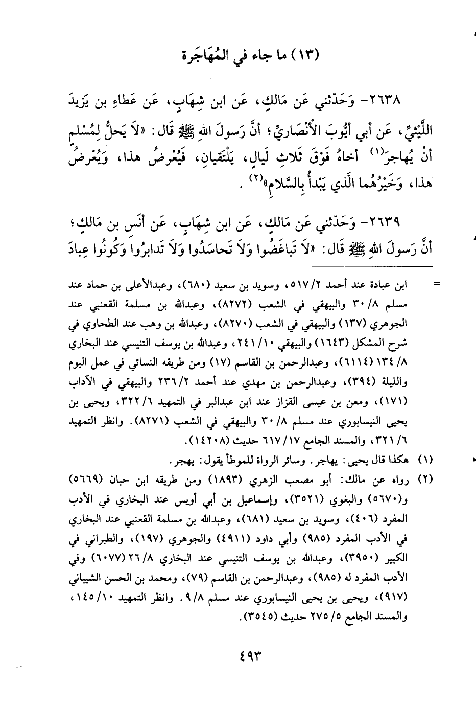 2638 - وَحَدَّثَنِي عَنْ مَالِكٍ، عَنِ ابْنِ شِهَابٍ، عَنْ عَطَاءِ بْنِ يَزِيدَ اللَّيْثِيِّ، عَنْ أَبِي أَيُّوبَ الأَنْصَارِيِّ، أَنَّ رَسُولَ اللهِ صَلى الله عَلَيهِ وَسَلمَ قَالَ: لاَ يَحِلُّ لِمُسْلِمٍ أَنْ يُهَاجِرَ أَخَاهُ فَوْقَ ثَلاَثِ لَيَالٍ، يَلْتَقِيَانِ فَيُعْرِضُ هَذَا، وَيُعْرِضُ هَذَا، وَخَيْرُهُمَا الَّذِي يَبْدَأُ بِالسَّلاَمِ.
