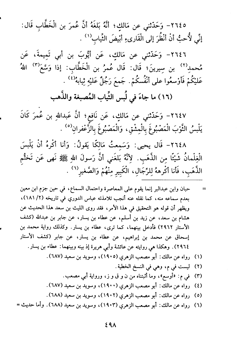 2647 - وَحَدَّثَنِي عَنْ مَالِكٍ، عَنْ نَافِعٍ، أَنَّ عَبْدَ اللهِ بْنَ عُمَرَ كَانَ يَلْبَسُ الثَّوْبَ الْمَصْبُوغَ بِالْمِشْقِ، وَالْمَصْبُوغَ بِالزَّعْفَرَانِ.