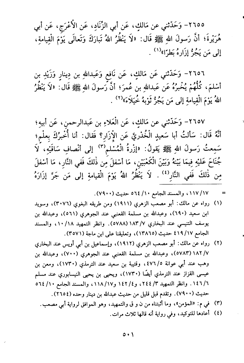 2656 - وَحَدَّثَنِي عَنْ مَالِكٍ (1)، عَنْ نَافِعٍ، وَعَبْدِ اللهِ بْنِ دِينَارٍ، وَزَيْدِ بْنِ أَسْلَمَ، كُلُّهُمْ يُخْبِرُهُ عَنْ عَبْدِ اللهِ بْنِ عُمَرَ؛ أَنَّ رَسُولَ اللهِ صَلى الله عَلَيهِ وَسَلمَ قَالَ: لاَ يَنْظُرُ اللهُ يَوْمَ الْقِيَامَةِ إِلَى مَنْ يَجُرُّ ثَوْبَهُ خُيَلاَءَ.