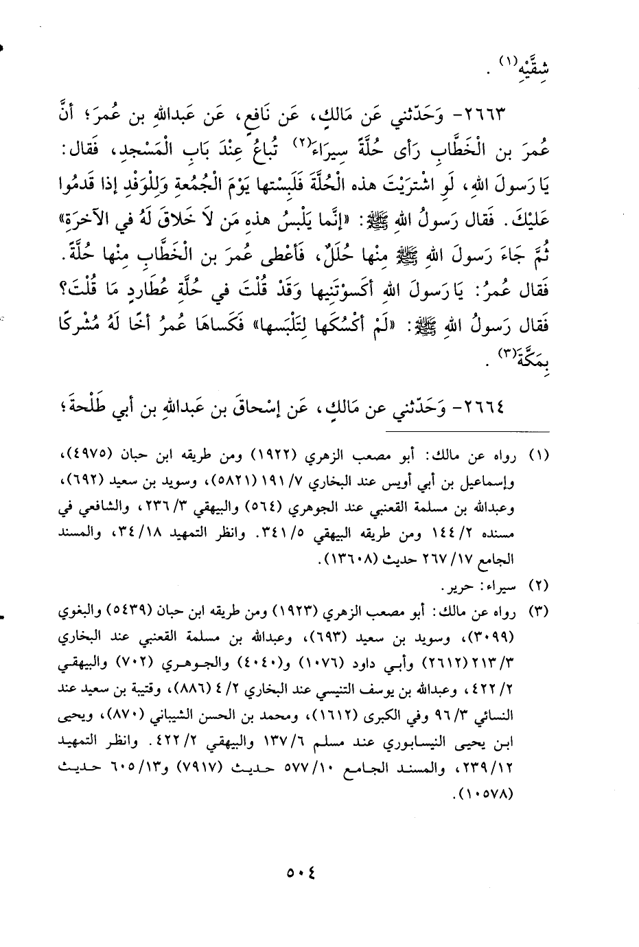 2663 - وَحَدَّثَنِي عَنْ مَالِكٍ (1)، عَنْ نَافِعٍ، عَنْ عَبْدِ اللهِ بْنِ عُمَرَ؛ أَنَّ عُمَرَ بْنَ الْخَطَّابِ رَأَى حُلَّةً سِيَرَاءَ تُبَاعُ عِنْدَ بَابِ الْمَسْجِدِ، فَقَالَ: يَا رَسُولَ اللهِ، لَوِ اشْتَرَيْتَ هَذِهِ الْحُلَّةَ، فَلَبِسْتَهَا يَوْمَ الْجُمُعَةِ، وَلِلْوَفْدِ إِذَا قَدِمُوا عَلَيْكَ؟ فَقَالَ رَسُولُ اللهِ صَلى الله عَلَيهِ وَسَلمَ: إِنَّمَا يَلْبَسُ هَذِهِ مَنْ لاَ خَلاَقَ لَهُ فِي الآخِرَةِ، ثُمَّ جَاءَ رَسُولَ اللهِ صَلى الله عَلَيهِ وَسَلمَ مِنْهَا حُلَلٌ، فَأَعْطَى عُمَرَ بْنَ الْخَطَّابِ مِنْهَا حُلَّةً، فَقَالَ عُمَرُ: يَا رَسُولَ اللهِ، أَكَسَوْتَنِيهَا، وَقَدْ قُلْتَ فِي حُلَّةِ عُطَارِدٍ مَا قُلْتَ؟ فَقَالَ رَسُولُ اللهِ صَلى الله عَلَيهِ وَسَلمَ: لَمْ أَكْسُكَهَا لِتَلْبَسَهَا، فَكَسَاهَا عُمَرُ أَخًا لَهُ مُشْرِكًا بِمَكَّةَ.