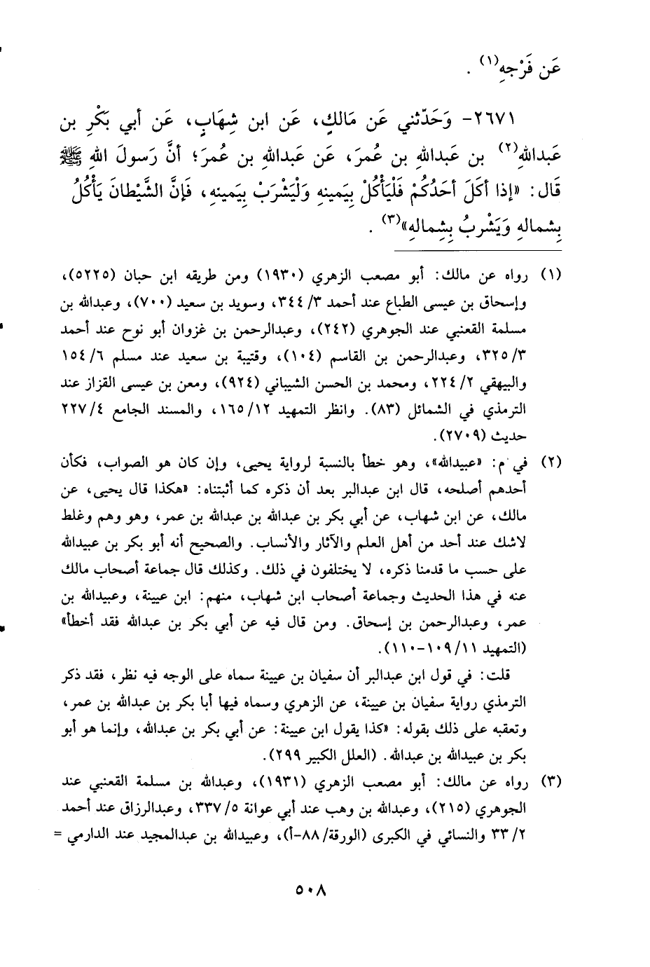 2671 - وَحَدَّثَنِي عَنْ مَالِكٍ (1)، عَنِ ابْنِ شِهَابٍ، عَنْ أَبِي بَكْرِ بْنِ عَبْدِ اللهِ (2) بْنِ عَبْدِ اللهِ بْنِ عُمَرَ، عَنْ عَبْدِ اللهِ بْنِ عُمَرَ؛ أَنَّ رَسُولَ اللهِ صَلى الله عَلَيهِ وَسَلمَ قَالَ: إِذَا أَكَلَ أَحَدُكُمْ، فَلْيَأْكُلْ بِيَمِينِهِ، وَلْيَشْرَبْ بِيَمِينِهِ، فَإِنَّ الشَّيْطَانَ يَأْكُلُ بِشِمَالِهِ، وَيَشْرَبُ بِشِمَالِهِ.