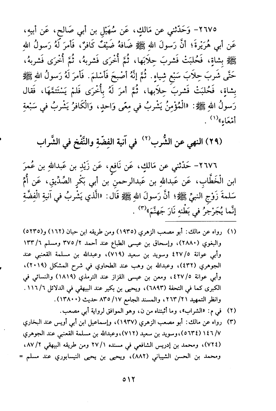 2676 - حَدَّثَنِي عَنْ مَالِكٍ، عَنْ نَافِعٍ، عَنْ زَيْدِ بْنِ عَبْدِ اللهِ بْنِ عُمَرَ بْنِ الْخَطَّابِ، عَنْ عَبْدِ اللهِ بْنِ عَبْدِ الرَّحْمَنِ بْنِ أَبِي بَكْرٍ الصِّدِّيقِ، عَنْ أُمِّ سَلَمَةَ، زَوْجِ النَّبِيِّ صَلى الله عَلَيهِ وَسَلمَ، أَنَّ رَسُولَ اللهِ صَلى الله عَلَيهِ وَسَلمَ قَالَ: الَّذِي يَشْرَبُ فِي آنِيَةِ الْفِضَّةِ، إِنَّمَا يُجَرْجِرُ فِي بَطْنِهِ نَارَ جَهَنَّمَ.