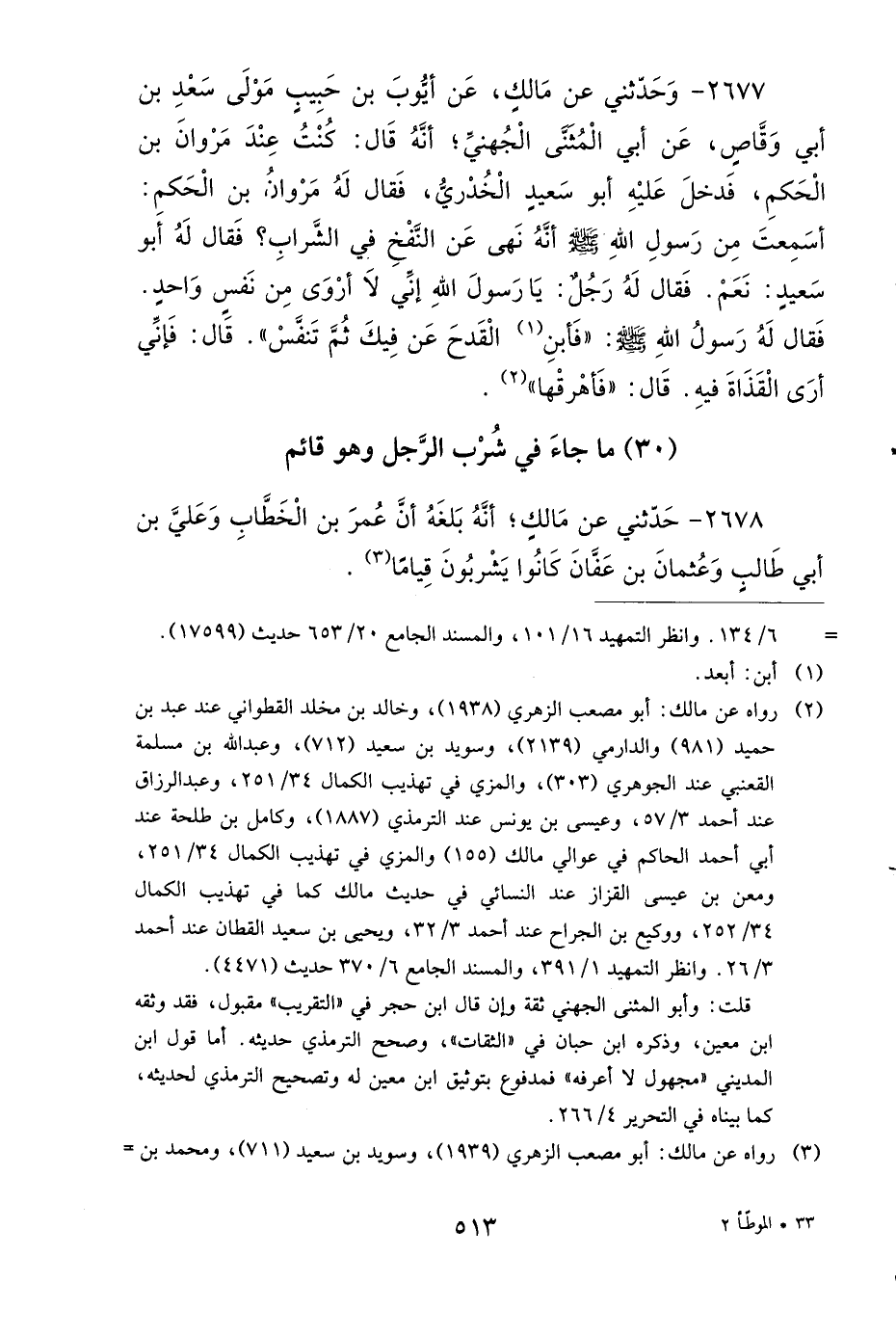 2678 - حَدَّثَنِي عَنْ مَالِكٍ؛ أَنَّهُ بَلَغَهُ أَنَّ عُمَرَ بْنَ الْخَطَّابِ، وَعَلِيَّ بْنَ أَبِي طَالِبٍ، وَعُثْمَانَ بْنَ عَفَّانَ كَانُوا يَشْرَبُونَ قِيَامًا.