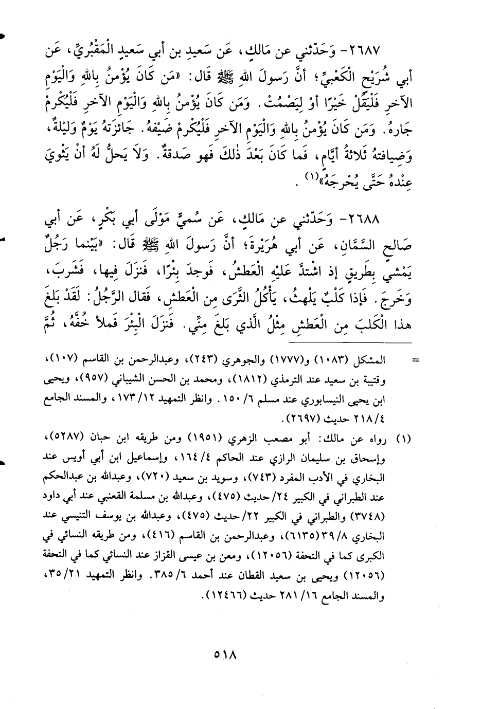2687 - وَحَدَّثَنِي عَنْ مَالِكٍ، عَنْ سَعِيدِ بْنِ أَبِي سَعِيدٍ الْمَقْبُرِيِّ، عَنْ أَبِي شُرَيْحٍ الْكَعْبِيِّ، أَنَّ رَسُولَ اللهِ صَلى الله عَلَيهِ وَسَلمَ قَالَ: مَنْ كَانَ يُؤْمِنُ بِاللَّهِ وَالْيَوْمِ الآخِرِ، فَلْيَقُلْ خَيْرًا أَوْ لِيَصْمُتْ، وَمَنْ كَانَ يُؤْمِنُ بِاللَّهِ وَالْيَوْمِ الآخِرِ، فَلْيُكْرِمْ جَارَهُ، وَمَنْ كَانَ يُؤْمِنُ بِاللَّهِ وَالْيَوْمِ الآخِرِ، فَلْيُكْرِمْ ضَيْفَهُ، جَائِزَتُهُ يَوْمٌ وَلَيْلَةٌ، وَضِيَافَتُهُ ثَلاَثَةُ أَيَّامٍ، فَمَا كَانَ بَعْدَ ذَلِكَ، فَهُوَ صَدَقَةٌ، وَلاَ يَحِلُّ لَهُ أَنْ يَثْوِيَ عِنْدَهُ حَتَّى يُحْرِجَهُ.