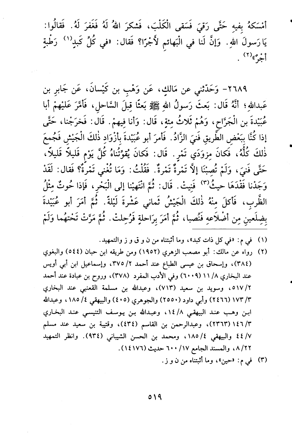 2689 - وَحَدَّثَنِي عَنْ مَالِكٍ، عَنْ وَهْبِ بْنِ كَيْسَانَ، عَنْ جَابِرِ بْنِ عَبْدِ اللهِ، أَنَّهُ قَالَ: بَعَثَ رَسُولُ اللهِ صَلى الله عَلَيهِ وَسَلمَ بَعْثًا قِبَلَ السَّاحِلِ، فَأَمَّرَ عَلَيْهِمْ أَبَا عُبَيْدَةَ بْنَ الْجَرَّاحِ، وَهُمْ ثَلاَثُمِئَةٍ، قَالَ: وَأَنَا فِيهِمْ، قَالَ: فَخَرَجْنَا حَتَّى إِذَا كُنَّا بِبَعْضِ الطَّرِيقِ، فَنِيَ الزَّادُ، فَأَمَرَ أَبُو عُبَيْدَةَ بِأَزْوَادِ ذَلِكَ الْجَيْشِ، فَجُمِعَ ذَلِكَ كُلُّهُ، فَكَانَ مِزْوَدَيْ تَمْرٍ، قَالَ: فَكَانَ يُقَوِّتُنَاهُ كُلَّ يَوْمٍ قَلِيلاً قَلِيلاً، حَتَّى فَنِيَ، وَلَمْ تُصِبْنَا إِلاَّ تَمْرَةٌ تَمْرَةٌ، فَقُلْتُ: وَمَا تُغْنِي تَمْرَةٌ، فَقَالَ: لَقَدْ وَجَدْنَا فَقْدَهَا حَيْثُ فَنِيَتْ، قَالَ: ثُمَّ انْتَهَيْنَا إِلَى الْبَحْرِ، فَإِذَا حُوتٌ مِثْلُ الظَّرِبِ، فَأَكَلَ مِنْهُ ذَلِكَ الْجَيْشُ ثَمَانِيَ عَشْرَةَ لَيْلَةً، ثُمَّ أَمَرَ أَبُو عُبَيْدَةَ بِضِلْعَيْنِ مِنْ أَضْلاَعِهِ، فَنُصِبَا، ثُمَّ أَمَرَ بِرَاحِلَةٍ فَرُحِلَتْ، ثُمَّ مَرَّتْ تَحْتَهُمَا وَلَمْ تُصِبْهُمَا.