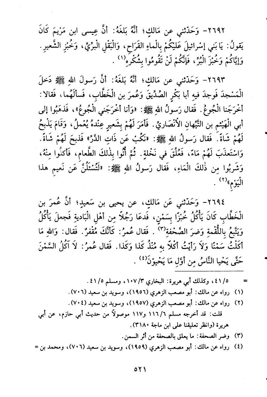 2693 - وَحَدَّثَنِي عَنْ مَالِكٍ؛ أَنَّهُ بَلَغَهُ، أَنَّ رَسُولَ اللهِ صَلى الله عَلَيهِ وَسَلمَ دَخَلَ الْمَسْجِدَ، فَوَجَدَ فِيهِ أَبَا بَكْرٍ الصِّدِّيقَ، وَعُمَرَ بْنَ الْخَطَّابِ، فَسَأَلَهُمَا، فَقَالاَ: أَخْرَجَنَا الْجُوعُ، فَقَالَ رَسُولُ اللهِ صَلى الله عَلَيهِ وَسَلمَ: وَأَنَا أَخْرَجَنِي الْجُوعُ، فَذَهَبُوا إِلَى أَبِي الْهَيْثَمِ بْنِ التَّيِّهَانِ الأَنْصَارِيِّ، فَأَمَرَ لَهُمْ بِشَعِيرٍ عِنْدَهُ يُعْمَلُ، وَقَامَ يَذْبَحُ لَهُمْ شَاةً، فَقَالَ رَسُولُ اللهِ صَلى الله عَلَيهِ وَسَلمَ: نَكِّبْ عَنْ ذَاتِ الدَّرِّ، فَذَبَحَ لَهُمْ شَاةً، وَاسْتَعْذَبَ لَهُمْ مَاءً، فَعُلِّقَ فِي نَخْلَةٍ، ثُمَّ أُتُوا بِذَلِكَ الطَّعَامِ، فَأَكَلُوا مِنْهُ، وَشَرِبُوا مِنْ ذَلِكَ الْمَاءِ، فَقَالَ رَسُولُ اللهِ صَلى الله عَلَيهِ وَسَلمَ: لَتُسْأَلُنَّ عَنْ نَعِيمِ هَذَا الْيَوْمِ.