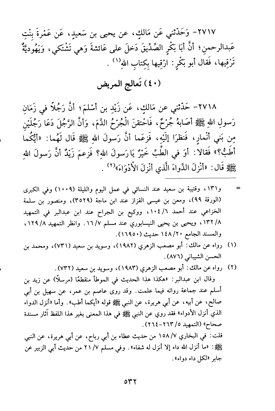2718 - حَدَّثَنِي عَنْ مَالِكٍ، عَنْ زَيْدِ بْنِ أَسْلَمَ، أَنَّ رَجُلاً فِي زَمَانِ رَسُولِ اللهِ صَلى الله عَلَيهِ وَسَلمَ أَصَابَهُ جُرْحٌ، فَاحْتَقَنَ الْجُرْحُ الدَّمَ، وَأَنَّ الرَّجُلَ دَعَا رَجُلَيْنِ مِنْ بَنِي أَنْمَارٍ فَنَظَرَا إِلَيْهِ، فَزَعَمَا أَنَّ رَسُولَ اللهِ صَلى الله عَلَيهِ وَسَلمَ قَالَ لَهُمَا: أَيُّكُمَا أَطَبُّ؟ فَقَالاَ: أَوَ فِي الطِّبِّ خَيْرٌ يَا رَسُولَ اللهِ؟ فَزَعَمَ زَيْدٌ، أَنَّ رَسُولَ اللهِ صَلى الله عَلَيهِ وَسَلمَ قَالَ: أَنْزَلَ الدَّوَاءَ الَّذِي أَنْزَلَ الأَدْوَاءَ.