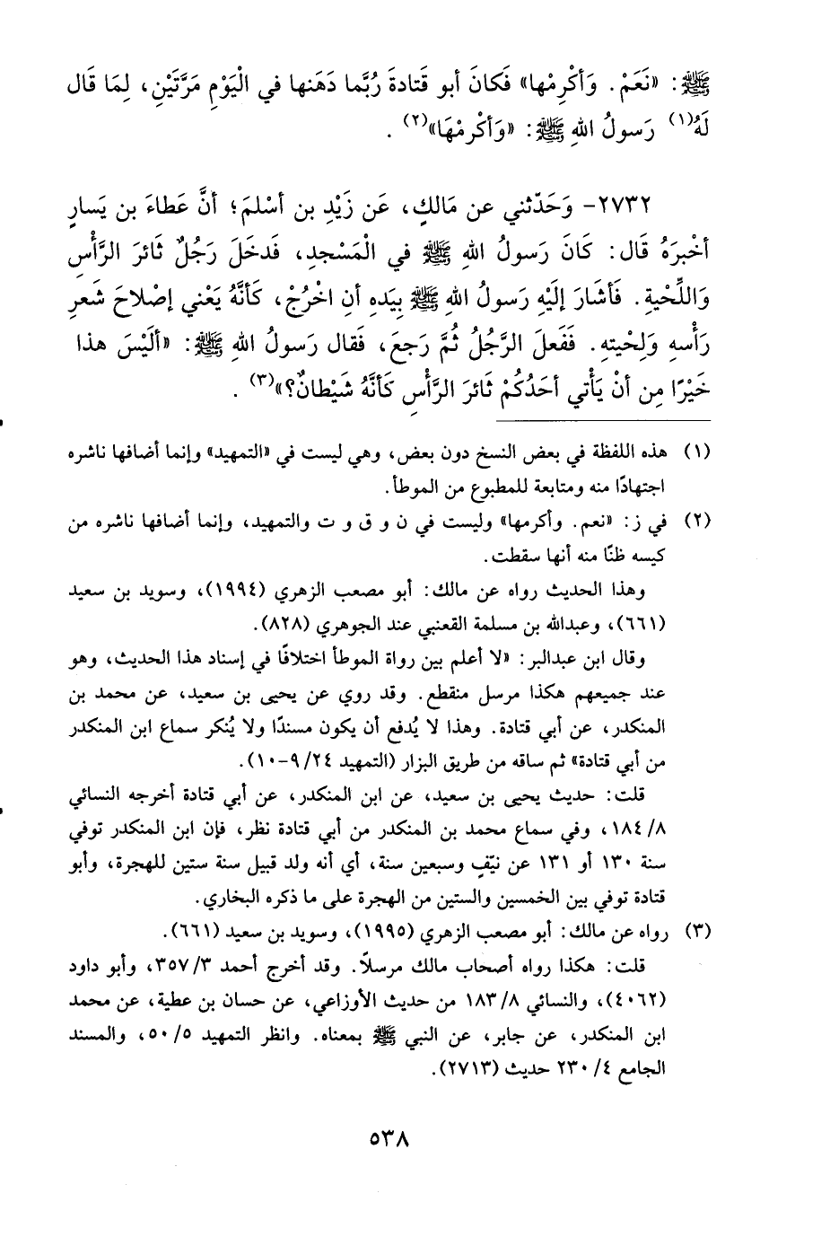 2732 - وَحَدَّثَنِي عَنْ مَالِكٍ، عَنْ زَيْدِ بْنِ أَسْلَمَ، أَنَّ عَطَاءَ بْنَ يَسَارٍ أَخْبَرَهُ قَالَ: كَانَ رَسُولُ اللهِ صَلى الله عَلَيهِ وَسَلمَ فِي الْمَسْجِدِ، فَدَخَلَ رَجُلٌ ثَائِرَ الرَّأْسِ وَاللِّحْيَةِ، فَأَشَارَ إِلَيْهِ رَسُولُ اللهِ صَلى الله عَلَيهِ وَسَلمَ بِيَدِهِ أَنِ اخْرُجْ، كَأَنَّهُ يَعْنِي، إِصْلاَحَ شَعَرِ رَأْسِهِ وَلِحْيَتِهِ، فَفَعَلَ الرَّجُلُ، ثُمَّ رَجَعَ، فَقَالَ رَسُولُ اللهِ صَلى الله عَلَيهِ وَسَلمَ: أَلَيْسَ هَذَا خَيْرًا مِنْ أَنْ يَأْتِيَ أَحَدُكُمْ ثَائِرَ الرَّأْسِ كَأَنَّهُ شَيْطَانٌ.
