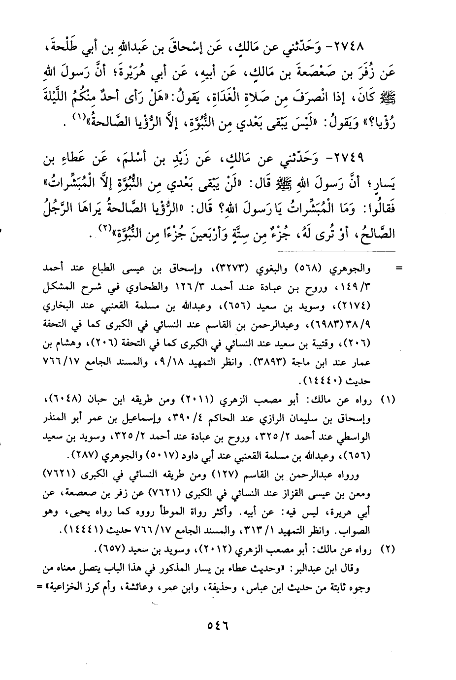 2748 - وَحَدَّثَنِي عَنْ مَالِكٍ، عَنْ إِسْحَاقَ بْنِ عَبْدِ اللهِ بْنِ أَبِي طَلْحَةَ، عَنْ زُفَرَ بْنِ صَعْصَعَةَ بْنِ مَالِكٍ، عَنْ أَبِيهِ، عَنْ أَبِي هُرَيْرَةَ، أَنَّ رَسُولَ اللهِ صَلى الله عَلَيهِ وَسَلمَ كَانَ إِذَا انْصَرَفَ مِنْ صَلاَةِ الْغَدَاةِ يَقُولُ: هَلْ رَأَى أَحَدٌ مِنْكُمُ اللَّيْلَةَ رُؤْيَا، وَيَقُولُ: لَيْسَ يَبْقَى بَعْدِي مِنَ النُّبُوَّةِ، إِلاَّ الرُّؤْيَا الصَّالِحَةُ.