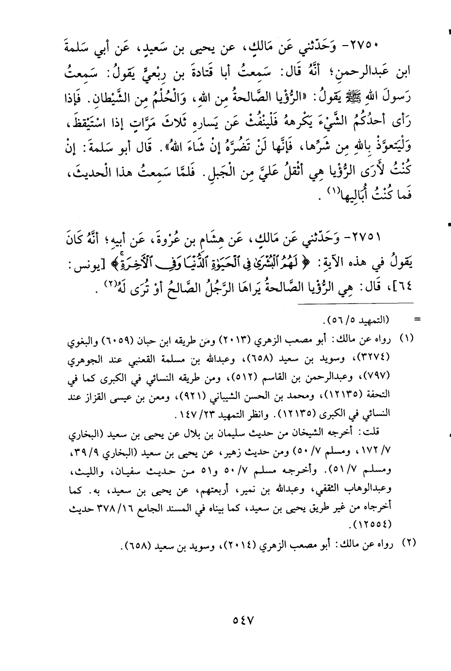 2750 - وَحَدَّثَنِي عَنْ مَالِكٍ، عَنْ يَحْيَى بْنِ سَعِيدٍ، عَنْ أَبِي سَلَمَةَ بْنِ عَبْدِ الرَّحْمَنِ، أَنَّهُ قَالَ: سَمِعْتُ أَبَا قَتَادَةَ بْنَ رِبْعِيٍّ يَقُولُ: سَمِعْتُ رَسُولَ اللهِ صَلى الله عَلَيهِ وَسَلمَ يَقُولُ: الرُّؤْيَا الصَّالِحَةُ مِنَ اللهِ، وَالْحُلْمُ مِنَ الشَّيْطَانِ، فَإِذَا رَأَى أَحَدُكُمُ الشَّيْءَ يَكْرَهُهُ، فَلْيَنْفُثْ عَنْ يَسَارِهِ ثَلاَثَ مَرَّاتٍ إِذَا اسْتَيْقَظَ، وَلْيَتَعَوَّذْ بِاللَّهِ مِنْ شَرِّهَا، فَإِنَّهَا لَنْ تَضُرَّهُ إِنْ شَاءَ اللهُ، قَالَ أَبُو سَلَمَةَ: إِنْ كُنْتُ لأَرَى الرُّؤْيَا هِيَ أَثْقَلُ عَلَيَّ مِنَ الْجَبَلِ، فَلَمَّا سَمِعْتُ هَذَا الْحَدِيثَ فَمَا كُنْتُ أُبَالِيهَا.