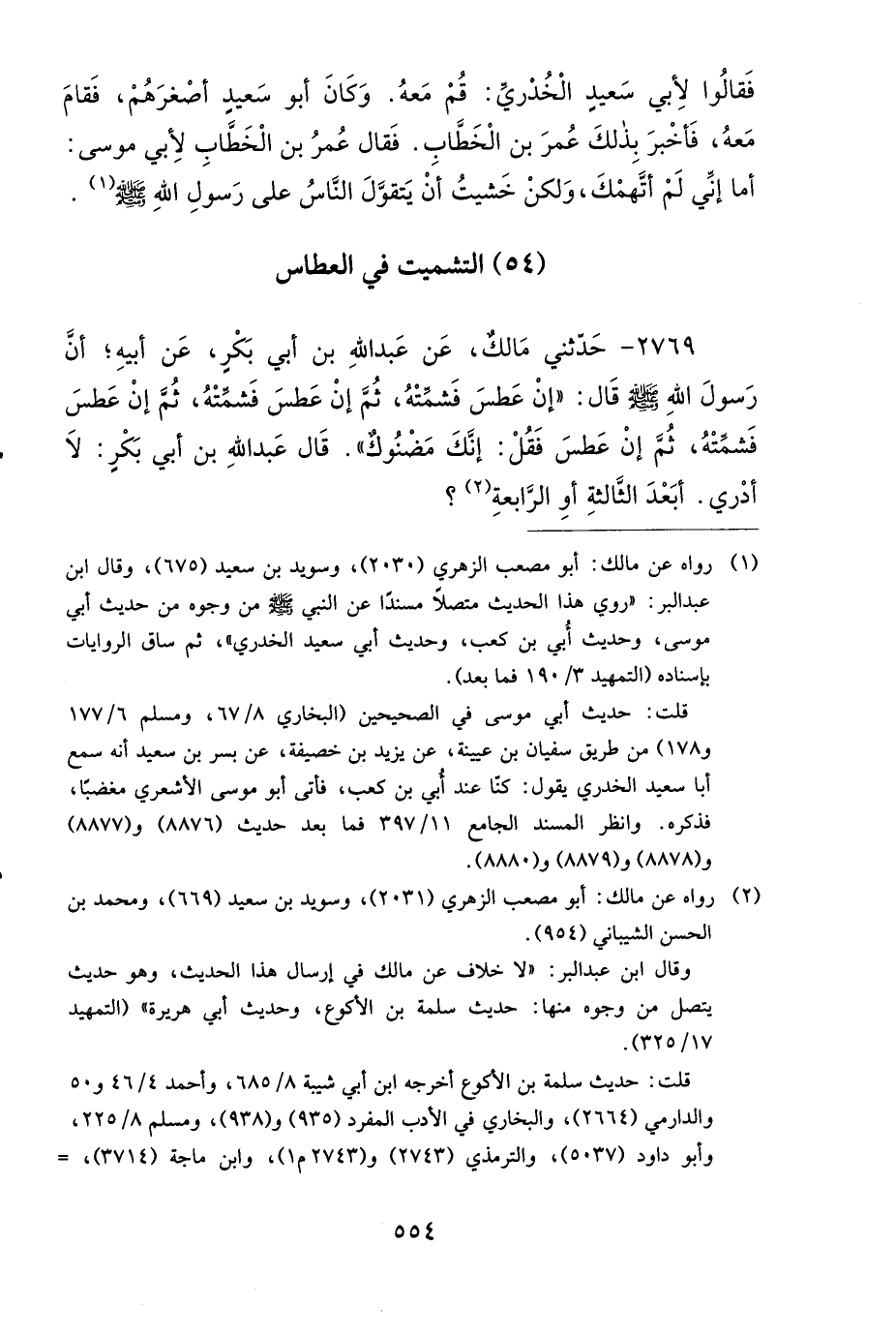 2769 - حَدَّثَنِي مَالِكٌ، عَنْ عَبْدِ اللهِ بْنِ أَبِي بَكْرٍ، عَنْ أَبِيهِ، أَنَّ رَسُولَ اللهِ صَلى الله عَلَيهِ وَسَلمَ قَالَ: إِنْ عَطَسَ فَشَمِّتْهُ، ثُمَّ إِنْ عَطَسَ فَشَمِّتْهُ، ثُمَّ إِنْ عَطَسَ فَشَمِّتْهُ، ثُمَّ إِنْ عَطَسَ فَقُلْ: إِنَّكَ مَضْنُوكٌ، قَالَ عَبْدُ اللهِ بْنُ أَبِي بَكْرٍ: لاَ أَدْرِي أَبَعْدَ الثَّالِثَةِ أَوِ الرَّابِعَةِ.
