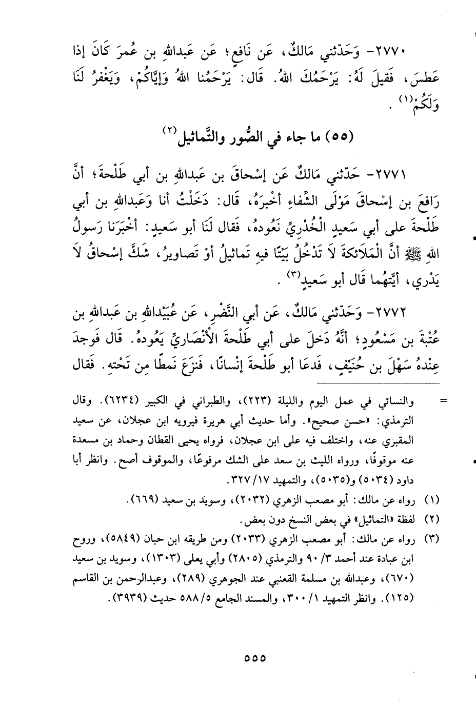 2772 - وَحَدَّثَنِي مَالِكٌ (1)، عَنْ أَبِي النَّضْرِ، عَنْ عُبَيْدِ اللهِ بْنِ عَبْدِ اللهِ بْنِ عُتْبَةَ بْنِ مَسْعُودٍ، أَنَّهُ دَخَلَ عَلَى أَبِي طَلْحَةَ الأَنْصَارِيِّ يَعُودُهُ، قَالَ: فَوَجَدَ عِنْدَهُ سَهْلَ بْنَ حُنَيْفٍ، فَدَعَا أَبُو طَلْحَةَ إِنْسَانًا، فَنَزَعَ نَمَطًا مِنْ تَحْتِهِ، فَقَالَ لَهُ سَهْلُ بْنُ حُنَيْفٍ: لِمَ تَنْزِعُهُ؟ قَالَ: لأَنَّ فِيهِ تَصَاوِيرَ، وَقَدْ قَالَ فِيهَا رَسُولُ اللهِ صَلى الله عَلَيهِ وَسَلمَ مَا قَدْ عَلِمْتَ، فَقَالَ سَهْلٌ: أَلَمْ يَقُلْ رَسُولُ اللهِ صَلى الله عَلَيهِ وَسَلمَ: إِلاَّ مَا كَانَ رَقْمًا فِي ثَوْبٍ، قَالَ: بَلَى، وَلَكِنَّهُ أَطْيَبُ لِنَفْسِي.