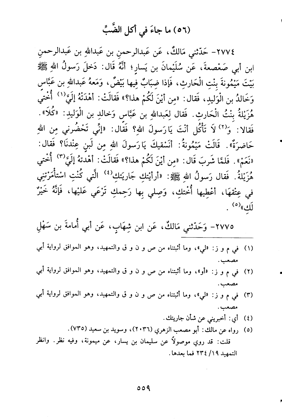 2774 - حَدَّثَنِي مَالِكٌ، عَنْ عَبْدِ الرَّحْمَنِ بْنِ عَبْدِ اللهِ بْنِ عَبْدِ الرَّحْمَنِ بْنِ أَبِي صَعْصَعَةَ، عَنْ سُلَيْمَانَ بْنِ يَسَارٍ، أَنَّهُ قَالَ: دَخَلَ رَسُولُ اللهِ صَلى الله عَلَيهِ وَسَلمَ بَيْتَ مَيْمُونَةَ بِنْتِ الْحَارِثِ، فَإِذَا ضِبَابٌ فِيهَا بَيْضٌ، وَمَعَهُ عَبْدُ اللهِ بْنُ عَبَّاسٍ، وَخَالِدُ بْنُ الْوَلِيدِ، فَقَالَ: مِنْ أَيْنَ لَكُمْ هَذَا؟ فَقَالَتْ: أَهْدَتْهُ إِلَيَّ أُخْتِي هُزَيْلَةُ بِنْتُ الْحَارِثِ، فَقَالَ لِعَبْدِ اللهِ بْنِ عَبَّاسٍ، وَخَالِدِ بْنِ الْوَلِيدِ: كُلاَ، فَقَالاَ: وَلاَ تَأْكُلُ أَنْتَ يَا رَسُولَ اللهِ؟ فَقَالَ: إِنِّي تَحْضُرُنِي مِنَ اللهِ حَاضِرَةٌ، قَالَتْ مَيْمُونَةُ: أَنَسْقِيكَ يَا رَسُولَ اللهِ مِنْ لَبَنٍ عِنْدَنَا؟ فَقَالَ: نَعَمْ، فَلَمَّا شَرِبَ، قَالَ: مِنْ أَيْنَ لَكُمْ هَذَا؟ فَقَالَتْ: أَهْدَتْهُ إِلَيَّ أُخْتِي هُزَيْلَةُ، فَقَالَ رَسُولُ اللهِ صَلى الله عَلَيهِ وَسَلمَ: أَرَأَيْتِكِ جَارِيَتَكِ الَّتِي كُنْتِ اسْتَأْمَرْتِينِي فِي عِتْقِهَا، أَعْطِيهَا أُخْتَكِ، وَصِلِي بِهَا رَحِمَكِ، تَرْعَى عَلَيْهَا، فَإِنَّهُ خَيْرٌ لَكِ.