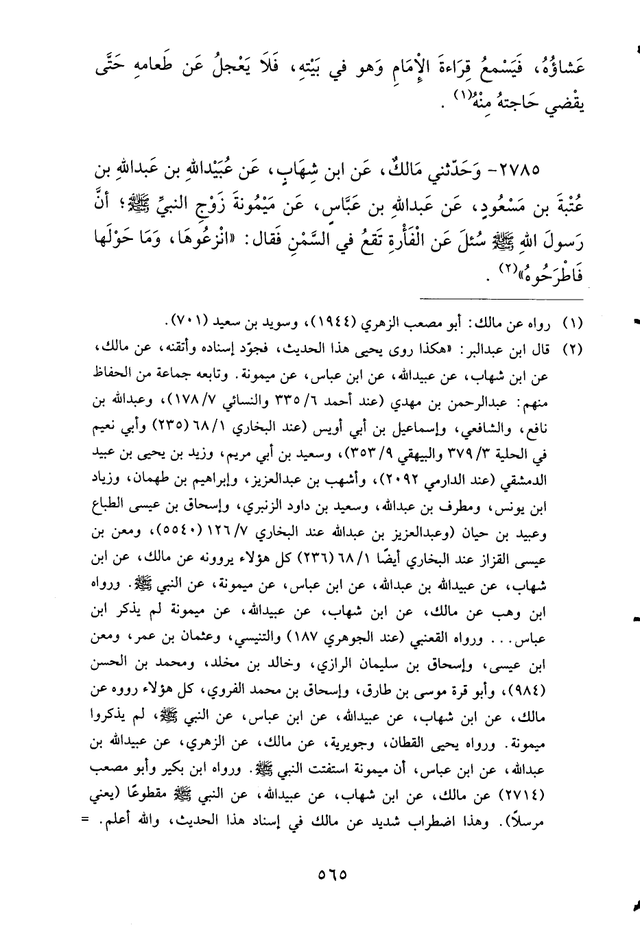 2785 - وَحَدَّثَنِي مَالِكٌ، عَنِ ابْنِ شِهَابٍ، عَنْ عُبَيْدِ اللهِ بْنِ عَبْدِ اللهِ بْنِ عُتْبَةَ بْنِ مَسْعُودٍ، عَنْ عَبْدِ اللهِ بْنِ عَبَّاسٍ، عَنْ مَيْمُونَةَ، زَوْجِ النَّبِيِّ صَلى الله عَلَيهِ وَسَلمَ، أَنَّ رَسُولَ اللهِ صَلى الله عَلَيهِ وَسَلمَ سُئِلَ عَنِ الْفَأْرَةِ تَقَعُ فِي السَّمْنِ؟ فَقَالَ: انْزِعُوهَا وَمَا حَوْلَهَا، فَاطْرَحُوهُ.