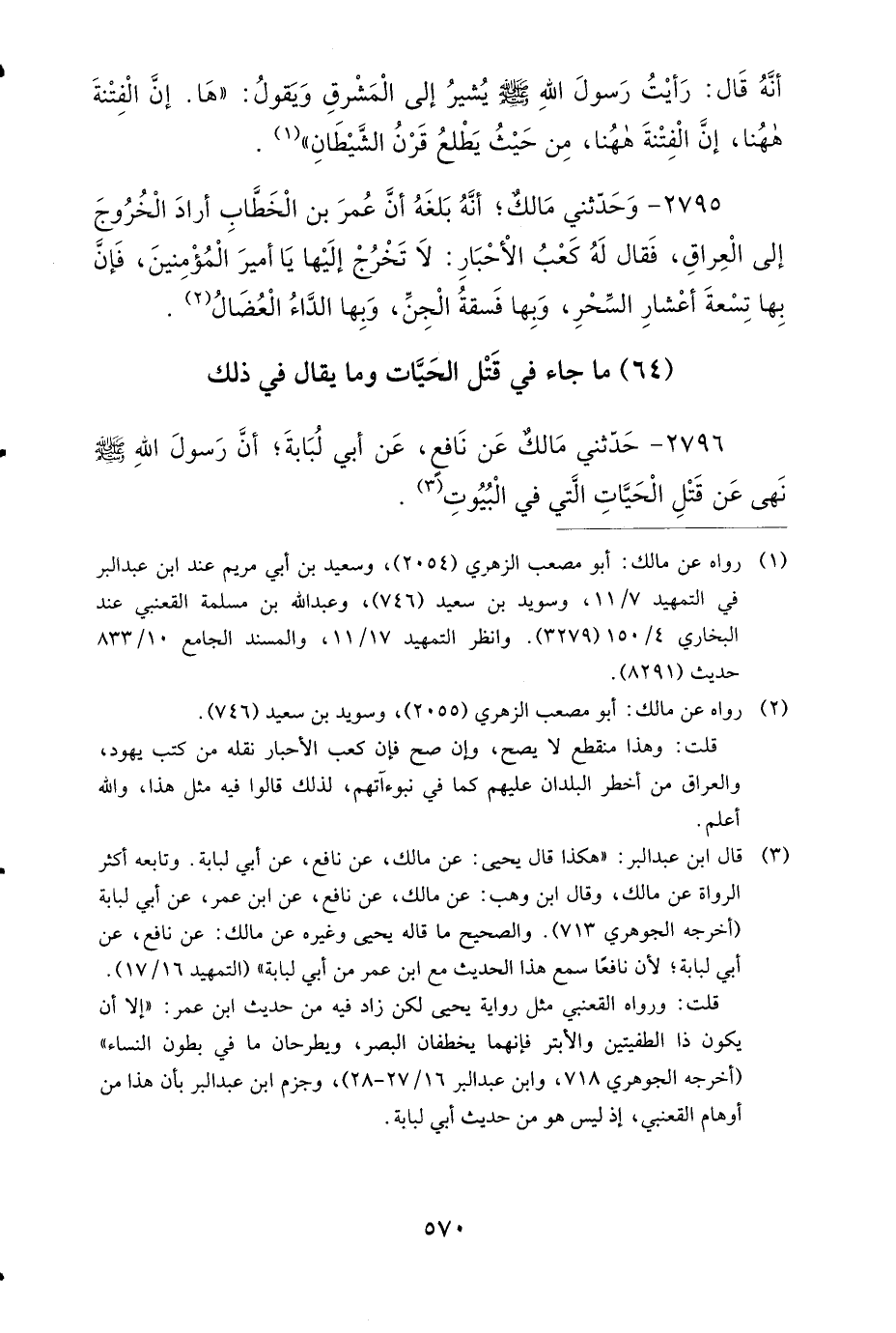 2796 - حَدَّثَنِي مَالِكٌ، عَنْ نَافِعٍ، عَنْ أَبِي لُبَابَةَ، أَنَّ رَسُولَ اللهِ صَلى الله عَلَيهِ وَسَلمَ نَهَى عَنْ قَتْلِ الْحَيَّاتِ الَّتِي فِي الْبُيُوتِ.