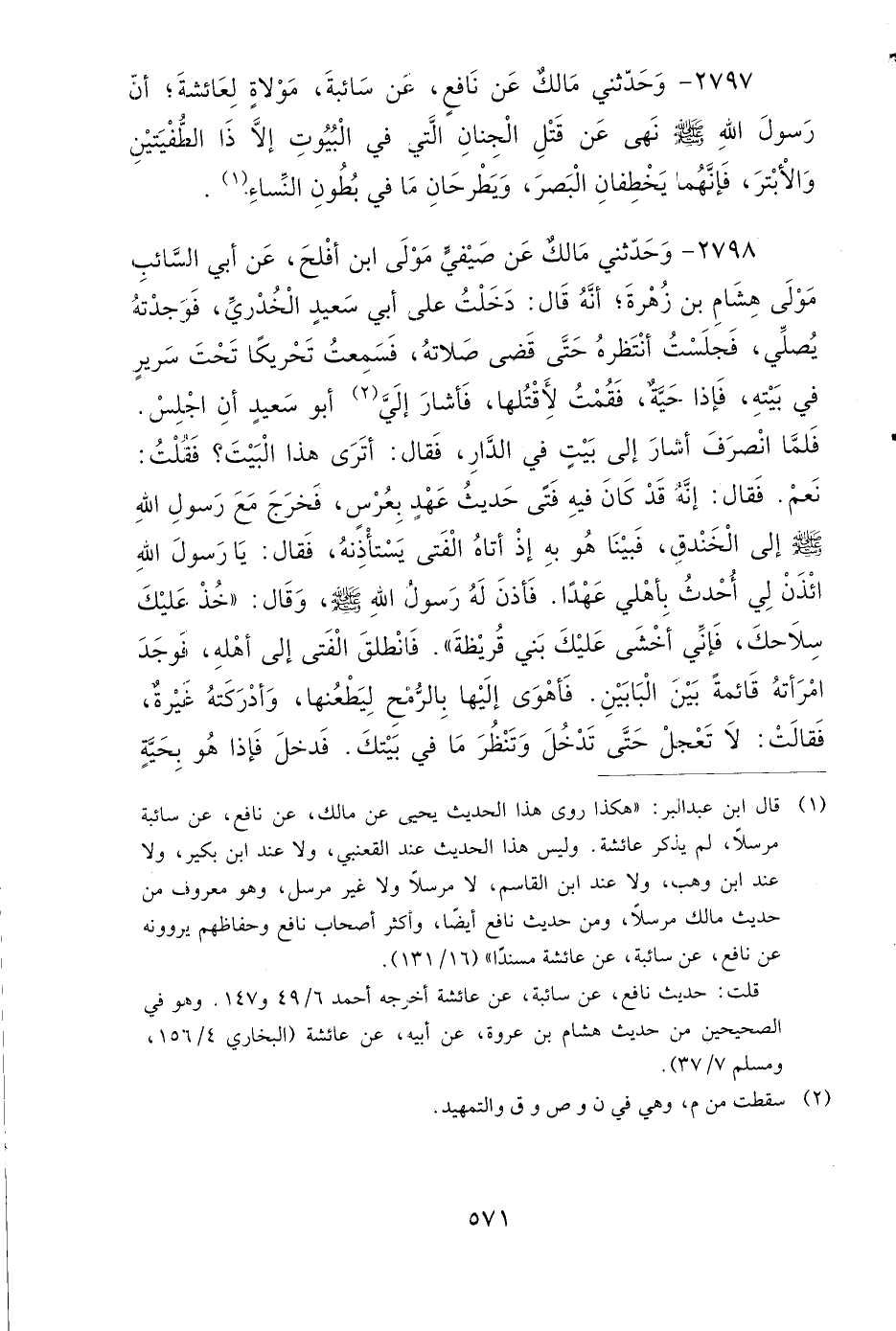 2797 - وَحَدَّثَنِي مَالِكٌ، عَنْ نَافِعٍ، عَنْ سَائِبَةَ، مَوْلاَةٍ لِعَائِشَةَ، أَنَّ رَسُولَ اللهِ صَلى الله عَلَيهِ وَسَلمَ نَهَى عَنْ قَتْلِ الْجِنَّانِ الَّتِي فِي الْبُيُوتِ، إِلاَّ ذَا الطُّفْيَتَيْنِ، وَالأَبْتَرَ، فَإِنَّهُمَا يَخْطِفَانِ الْبَصَرَ، وَيَطْرَحَانِ مَا فِي بُطُونِ النِّسَاءِ.