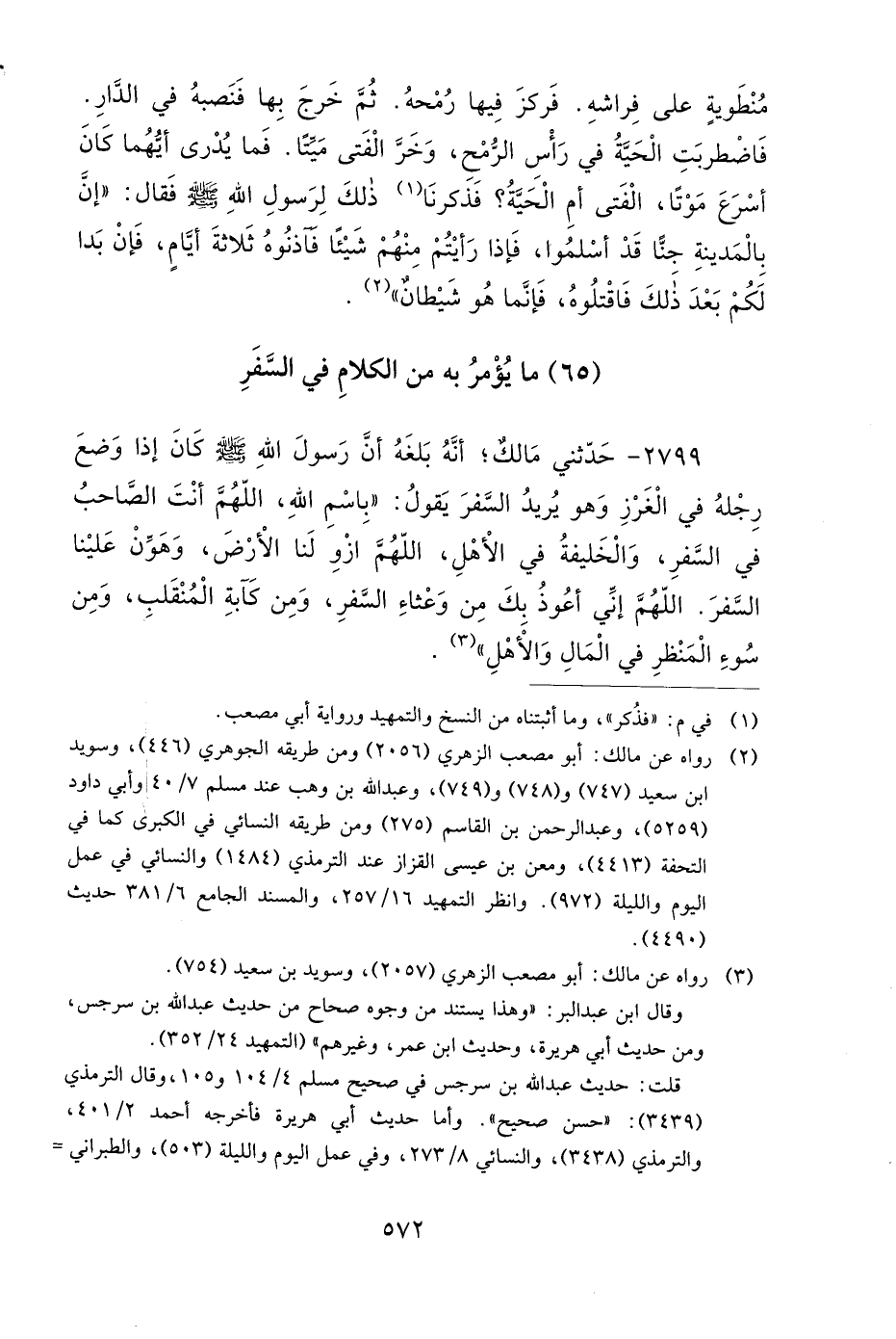 2799 - حَدَّثَنِي مَالِكٌ، أَنَّهُ بَلَغَهُ، أَنَّ رَسُولَ اللهِ صَلى الله عَلَيهِ وَسَلمَ كَانَ إِذَا وَضَعَ رِجْلَهُ فِي الْغَرْزِ، وَهُوَ يُرِيدُ السَّفَرَ يَقُولُ: بِاسْمِ اللهِ، اللهُمَّ أَنْتَ الصَّاحِبُ فِي السَّفَرِ، وَالْخَلِيفَةُ فِي الأَهْلِ، اللهُمَّ ازْوِ لَنَا الأَرْضَ، وَهَوِّنْ عَلَيْنَا السَّفَرَ، اللهُمَّ إِنِّي أَعُوذُ بِكَ مِنْ وَعْثَاءِ السَّفَرِ، وَمِنْ كَآبَةِ الْمُنْقَلَبِ، وَمِنْ سُوءِ الْمَنْظَرِ فِي الْمَالِ وَالأَهْلِ.