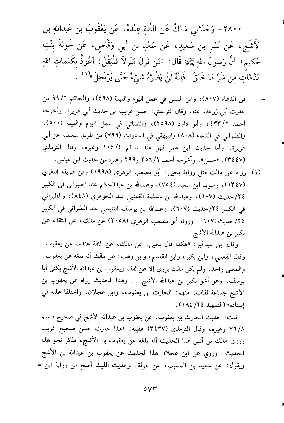 2800 - وَحَدَّثَنِي مَالِكٌ، عَنِ الثِّقَةِ عِنْدَهُ، عَنْ يَعْقُوبَ بْنِ عَبْدِ اللهِ بْنِ الأَشَجِّ، عَنْ بُسْرِ بْنِ سَعِيدٍ، عَنْ سَعْدِ بْنِ أَبِي وَقَّاصٍ، عَنْ خَوْلَةَ بِنْتِ حَكِيمٍ، أَنَّ رَسُولَ اللهِ صَلى الله عَلَيهِ وَسَلمَ قَالَ: مَنْ نَزَلَ مَنْزِلاً، فَلْيَقُلْ: أَعُوذُ بِكَلِمَاتِ اللهِ التَّامَّاتِ مِنْ شَرِّ مَا خَلَقَ، فَإِنَّهُ لَنْ يَضُرَّهُ شَيْءٌ حَتَّى يَرْتَحِلَ.