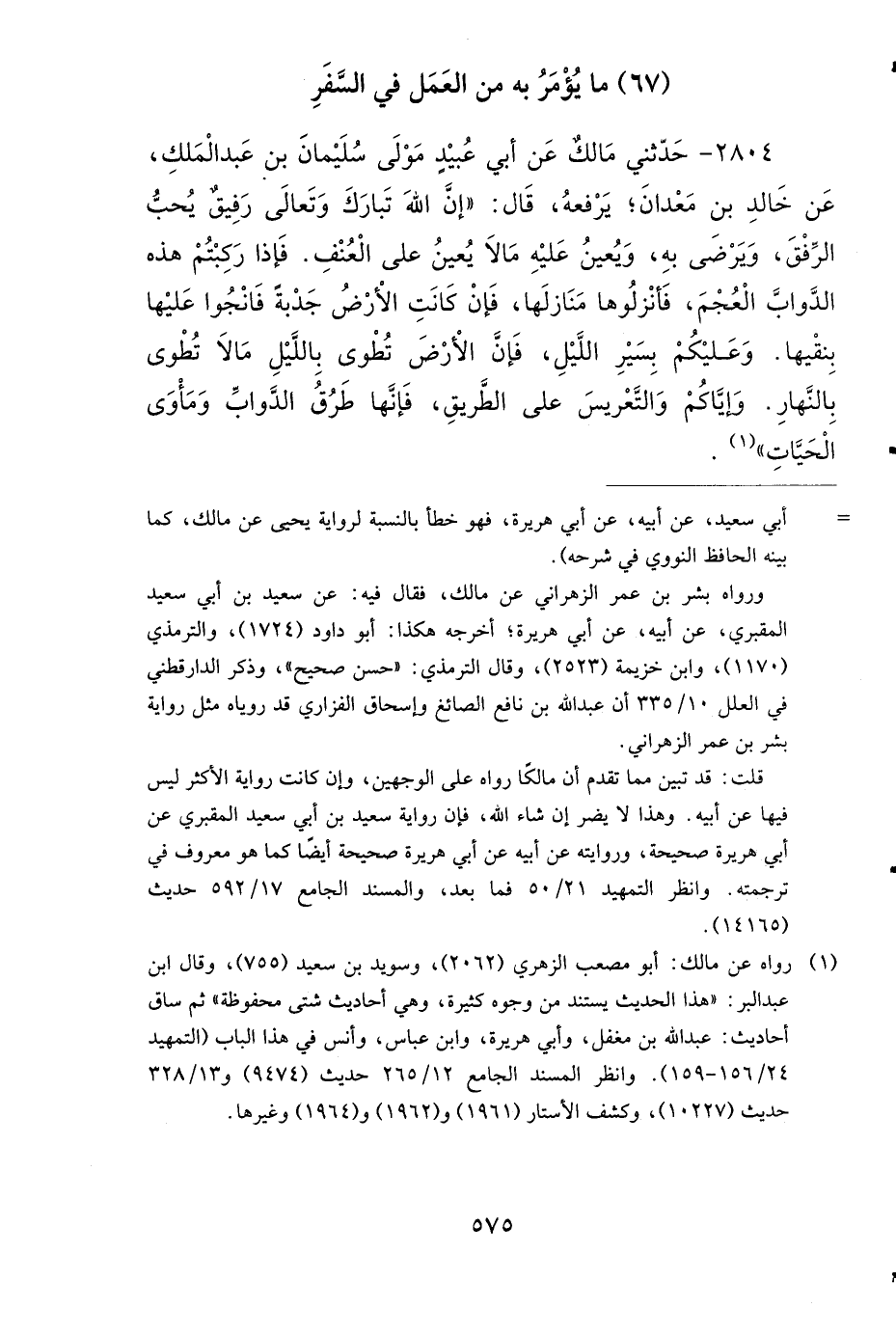 2804 - حَدَّثَنِي مَالِكٌ، عَنْ أَبِي عُبَيْدٍ، مَوْلَى سُلَيْمَانَ بْنِ عَبْدِ الْمَلِكِ، عَنْ خَالِدِ بْنِ مَعْدَانَ يَرْفَعُهُ قَالَ: إِنَّ اللهَ تَبَارَكَ وَتَعَالَى رَفِيقٌ يُحِبُّ الرِّفْقَ، وَيَرْضَى بِهِ، وَيُعِينُ عَلَيْهِ مَا لاَ يُعِينُ عَلَى الْعُنْفِ، فَإِذَا رَكِبْتُمْ هَذِهِ الدَّوَابَّ الْعُجْمَ، فَأَنْزِلُوهَا مَنَازِلَهَا، فَإِنْ كَانَتِ الأَرْضُ جَدْبَةً، فَانْجُوا عَلَيْهَا بِنِقْيِهَا، وَعَلَيْكُمْ بِسَيْرِ اللَّيْلِ، فَإِنَّ الأَرْضَ تُطْوَى بِاللَّيْلِ، مَا لاَ تُطْوَى بِالنَّهَارِ، وَإِيَّاكُمْ وَالتَّعْرِيسَ عَلَى الطَّرِيقِ، فَإِنَّهَا طُرُقُ الدَّوَابِّ، وَمَأْوَى الْحَيَّاتِ.
