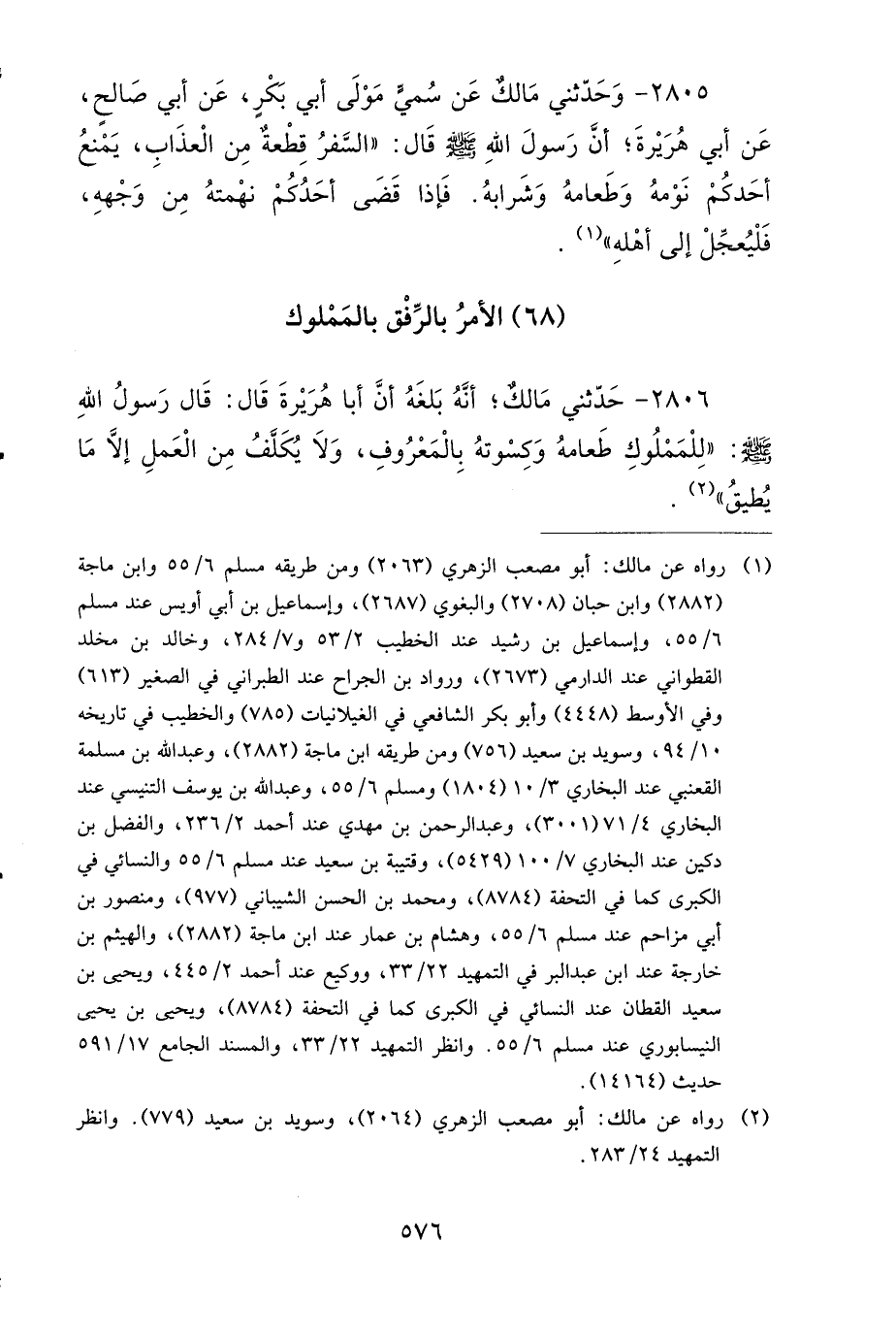 2806 - حَدَّثَنِي مَالِكٍ؛ أَنَّهُ بَلَغَهُ، أَنَّ أَبَا هُرَيْرَةَ قَالَ: قَالَ رَسُولُ اللهِ صَلى الله عَلَيهِ وَسَلمَ: لِلْمَمْلُوكِ طَعَامُهُ وَكِسْوَتُهُ بِالْمَعْرُوفِ، وَلاَ يُكَلَّفُ مِنَ الْعَمَلِ إِلاَّ مَا يُطِيقُ.