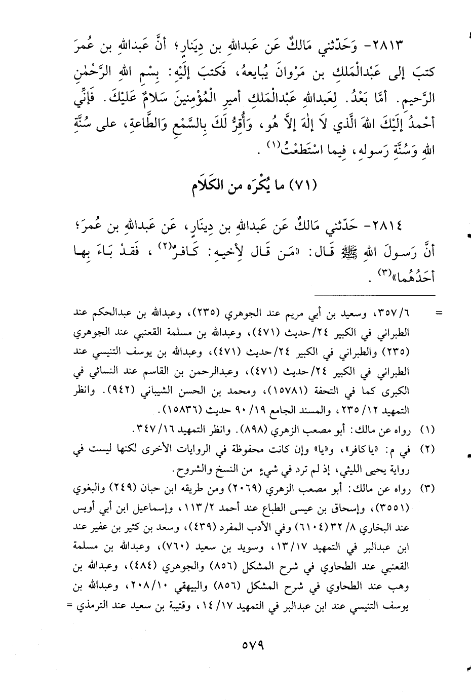 2814 - حَدَّثَنِي مَالِكٌ، عَنْ عَبْدِ اللهِ بْنِ دِينَارٍ، عَنْ عَبْدِ اللهِ بْنِ عُمَرَ؛ أَنَّ رَسُولَ اللهِ صَلى الله عَلَيهِ وَسَلمَ قَالَ: مَنْ قَالَ لأَخِيهِ كَافِرٌ، فَقَدْ بَاءَ بِهَا أَحَدُهُمَا.