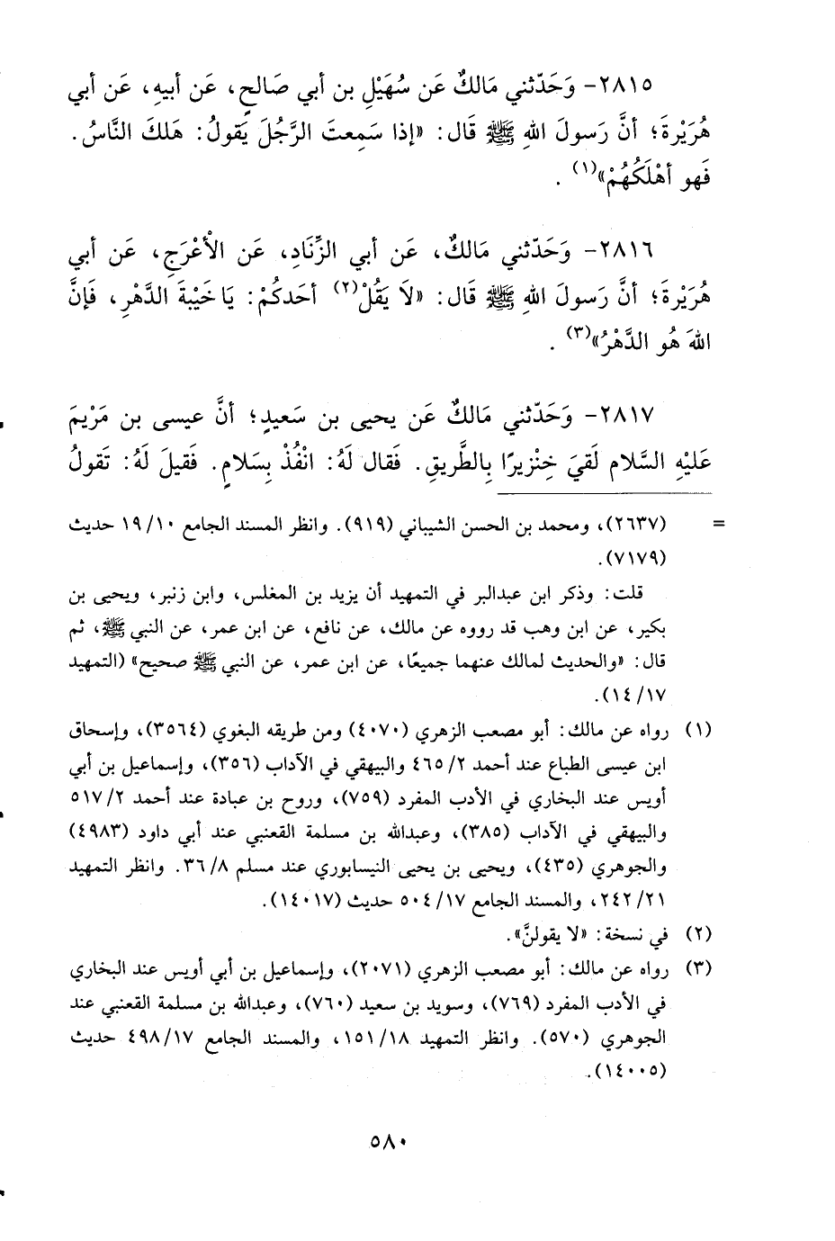 2816 - وَحَدَّثَنِي مَالِكٌ، عَنْ أَبِي الزِّنَادِ، عَنِ الأَعْرَجِ، عَنْ أَبِي هُرَيْرَةَ، أَنَّ رَسُولَ اللهِ صَلى الله عَلَيهِ وَسَلمَ قَالَ: لاَ يَقُلْ أَحَدُكُمْ: يَا خَيْبَةَ الدَّهْرِ، فَإِنَّ اللهَ هُوَ الدَّهْرُ.
