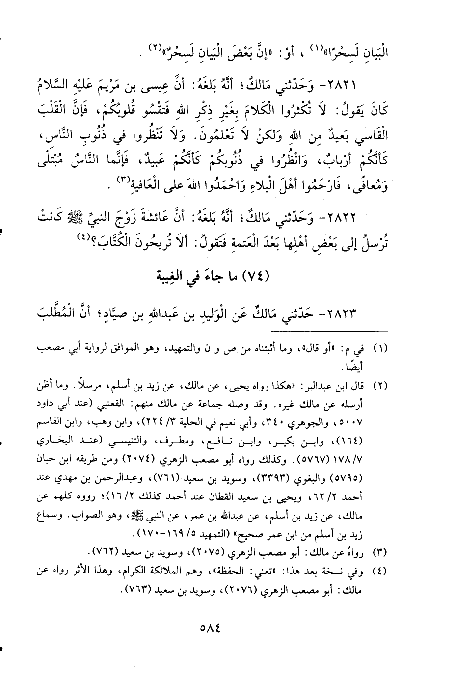 2823 - حَدَّثَنِي مَالِكٌ، عَنِ الْوَلِيدِ بْنِ عَبْدِ اللهِ بْنِ صَيَّادٍ، أَنَّ الْمُطَّلِبَ بْنَ عَبْدِ اللهِ بْنِ حُوَيْطِبَ الْمَخْزُومِيَّ أَخْبَرَهُ، أَنَّ رَجُلاً سَأَلَ رَسُولَ اللهِ صَلى الله عَلَيهِ وَسَلمَ: مَا الْغِيبَةُ؟ فَقَالَ رَسُولُ اللهِ صَلى الله عَلَيهِ وَسَلمَ: أَنْ تَذْكُرَ مِنَ الْمَرْءِ مَا يَكْرَهُ أَنْ يَسْمَعَ، قَالَ: يَا رَسُولَ اللهِ، وَإِنْ كَانَ حَقًّا؟ قَالَ رَسُولُ اللهِ صَلى الله عَلَيهِ وَسَلمَ: إِذَا قُلْتَ بَاطِلاً فَذَلِكَ الْبُهْتَانُ.