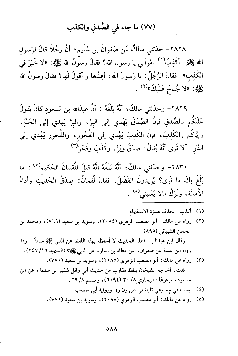 2828 - حَدَّثَنِي مَالِكٌ، عَنْ صَفْوَانَ بْنِ سُلَيْمٍ، أَنَّ رَجُلاً قَالَ لِرَسُولِ اللهِ صَلى الله عَلَيهِ وَسَلمَ: أَكْذِبُ امْرَأَتِي يَا رَسُولَ اللهِ؟ فَقَالَ رَسُولُ اللهِ صَلى الله عَلَيهِ وَسَلمَ: لاَ خَيْرَ فِي الْكَذِبِ، فَقَالَ الرَّجُلُ: يَا رَسُولَ اللهِ أَعِدُهَا، وَأَقُولُ لَهَا، فَقَالَ رَسُولُ اللهِ صَلى الله عَلَيهِ وَسَلمَ: لاَ جُنَاحَ عَلَيْكَ.