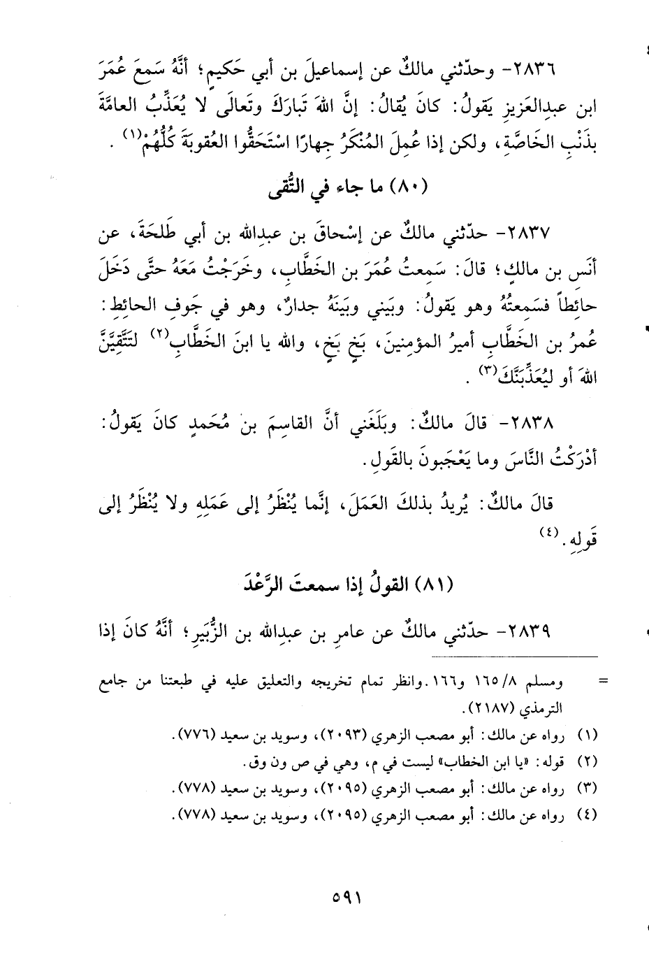 2837 - حَدَّثَنِي مَالِكٌ، عَنْ إِسْحَاقَ بْنِ عَبْدِ اللهِ بْنِ أَبِي طَلْحَةَ، عَنْ أَنَسِ بْنِ مَالِكٍ قَالَ: سَمِعْتُ عُمَرَ بْنَ الْخَطَّابِ، وَخَرَجْتُ مَعَهُ، حَتَّى دَخَلَ حَائِطًا، فَسَمِعْتُهُ وَهُوَ يَقُولُ: وَبَيْنِي وَبَيْنَهُ جِدَارٌ وَهُوَ فِي جَوْفِ الْحَائِطِ: عُمَرُ بْنُ الْخَطَّابِ أَمِيرُ الْمُؤْمِنِينَ، بَخٍ بَخٍ، وَاللَّهِ يَابْنَ الْخَطَّابِ، لَتَتَّقِيَنَّ اللهَ أَوْ لَيُعَذِّبَنَّكَ.