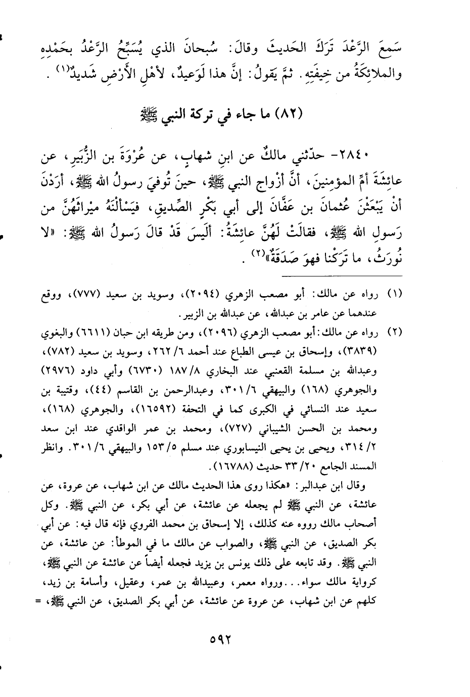 2840 - حَدَّثَنِي مَالِكٌ، عَنِ ابْنِ شِهَابٍ، عَنْ عُرْوَةَ بْنِ الزُّبَيْرِ، عَنْ عَائِشَةَ أُمِّ الْمُؤْمِنِينَ، أَنَّ أَزْوَاجَ النَّبِيِّ صَلى الله عَلَيهِ وَسَلمَ حِينَ تُوُفِّيَ رَسُولُ اللهِ صَلى الله عَلَيهِ وَسَلمَ، أَرَدْنَ أَنْ يَبْعَثْنَ عُثْمَانَ بْنَ عَفَّانَ إِلَى أَبِي بَكْرٍ الصِّدِّيقِ فَيَسْأَلْنَهُ مِيرَاثَهُنَّ مِنْ رَسُولِ اللهِ صَلى الله عَلَيهِ وَسَلمَ، فَقَالَتْ لَهُنَّ عَائِشَةُ: أَلَيْسَ قَدْ قَالَ رَسُولُ اللهِ صَلى الله عَلَيهِ وَسَلمَ: لاَ نُورَثُ، مَا تَرَكْنَا فَهُوَ صَدَقَةٌ.