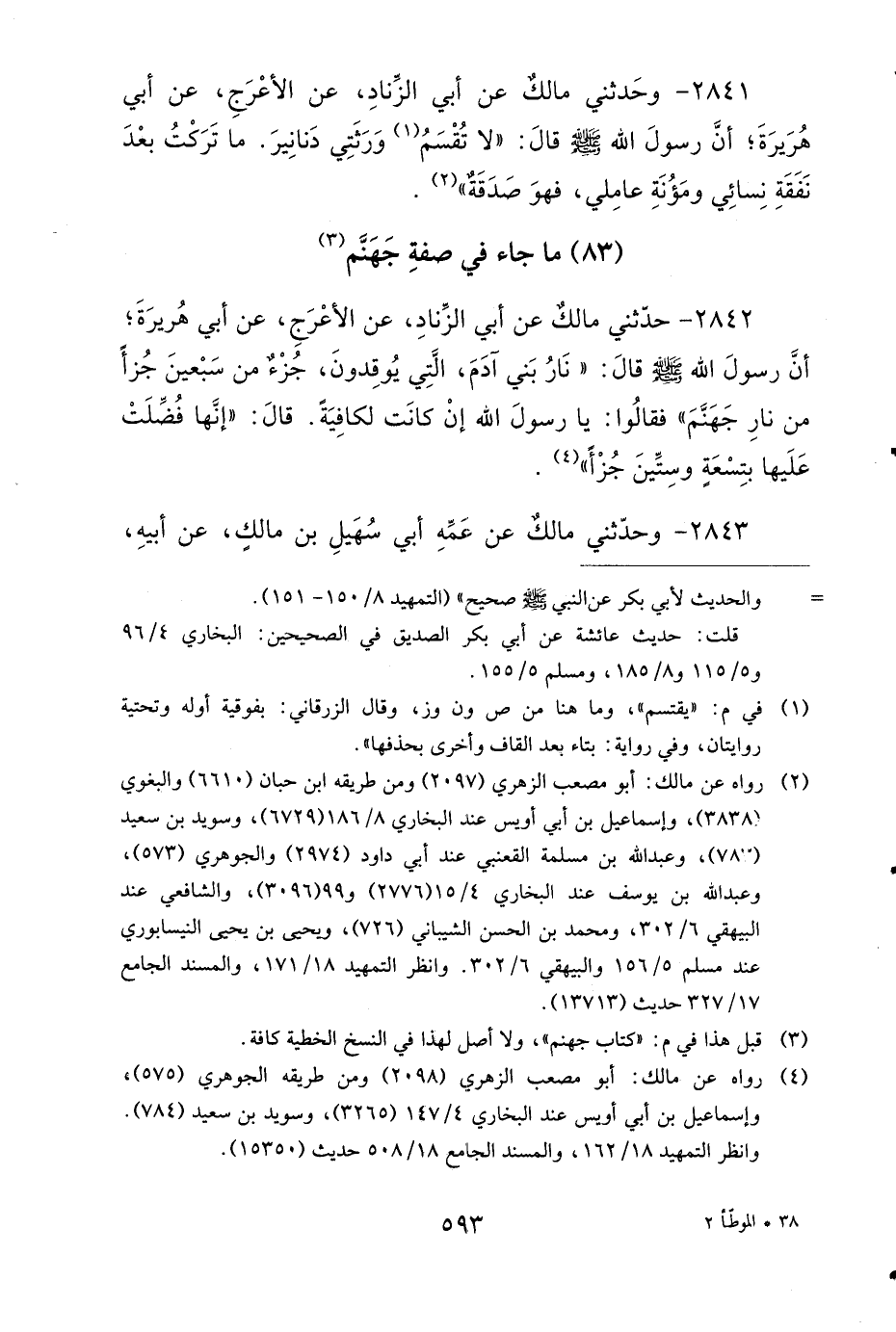 2842 - حَدَّثَنِي مَالِكٌ، عَنْ أَبِي الزِّنَادِ، عَنِ الأَعْرَجِ، عَنْ أَبِي هُرَيْرَةَ، أَنَّ رَسُولَ اللهِ صَلى الله عَلَيهِ وَسَلمَ قَالَ: نَارُ بَنِي آدَمَ الَّتِي يُوقِدُونَ جُزْءٌ مِنْ سَبْعِينَ جُزْءًا مِنْ نَارِ جَهَنَّمَ، فَقَالُوا: يَا رَسُولَ اللهِ، إِنْ كَانَتْ لَكَافِيَةً، قَالَ: إِنَّهَا فُضِّلَتْ عَلَيْهَا بِتِسْعَةٍ وَسِتِّينَ جُزْءًا.