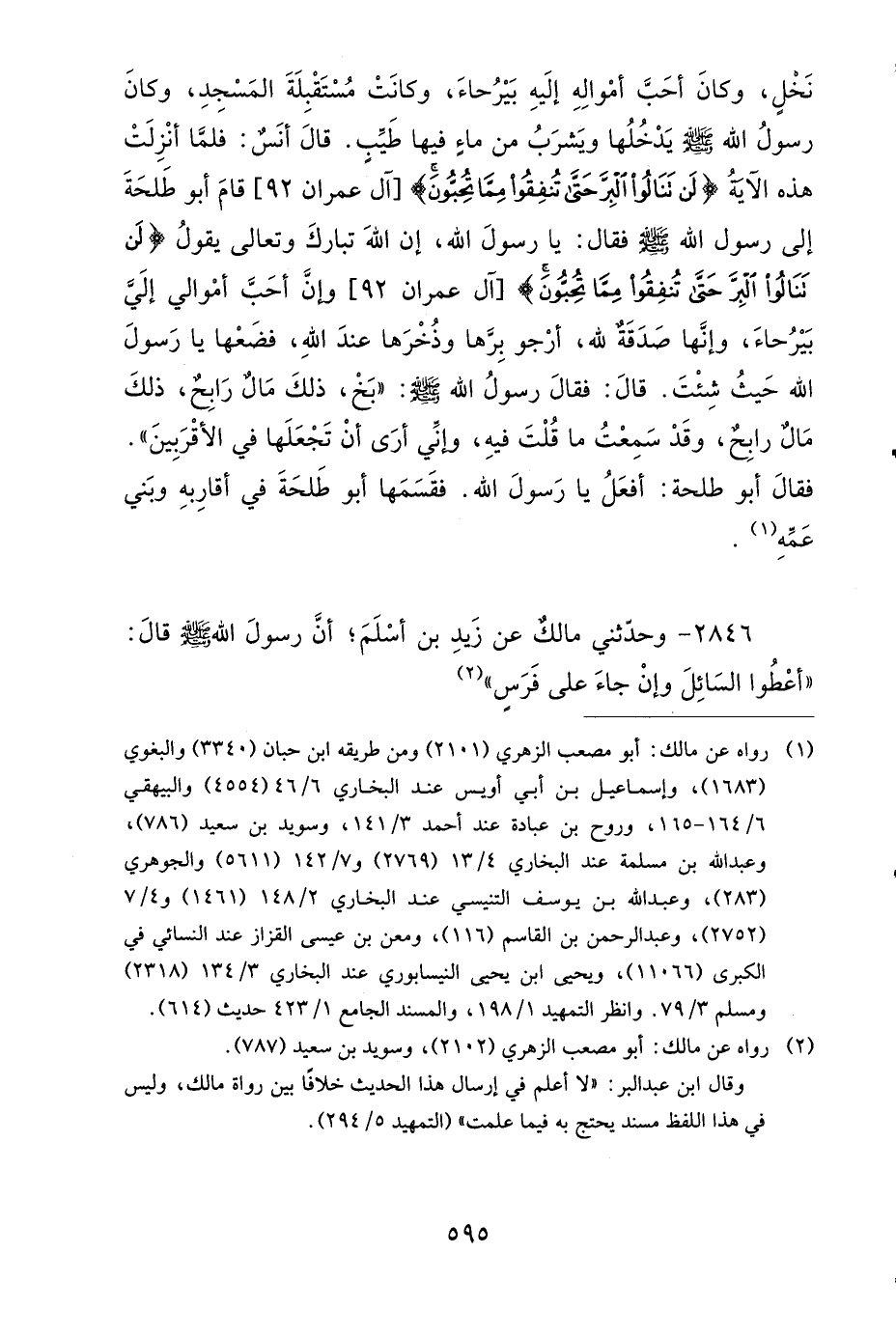 2846 - وَحَدَّثَنِي مَالِكٌ، عَنْ زَيْدِ بْنِ أَسْلَمَ، أَنَّ رَسُولَ اللهِ صَلى الله عَلَيهِ وَسَلمَ قَالَ: أَعْطُوا السَّائِلَ، وَإِنْ جَاءَ عَلَى فَرَسٍ.