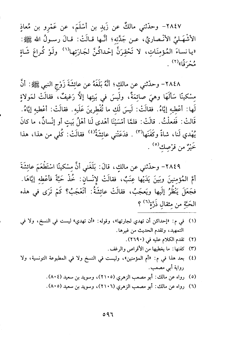 2847 - وَحَدَّثَنِي مَالِكٌ، عَنْ زَيْدِ بْنِ أَسْلَمَ، عَنْ عَمْرِو بْنِ مُعَاذٍ الأَشْهَلِيِّ الأَنْصَارِيِّ، عَنْ جَدَّتِهِ، أَنَّهَا قَالَتْ: قَالَ رَسُولُ اللهِ صَلى الله عَلَيهِ وَسَلمَ: يَا نِسَاءَ الْمُؤْمِنَاتِ، لاَ تَحْقِرَنَّ إِحْدَاكُنَّ لِجَارَتِهَا، وَلَوْ كُرَاعَ شَاةٍ مُحْرَقًا.