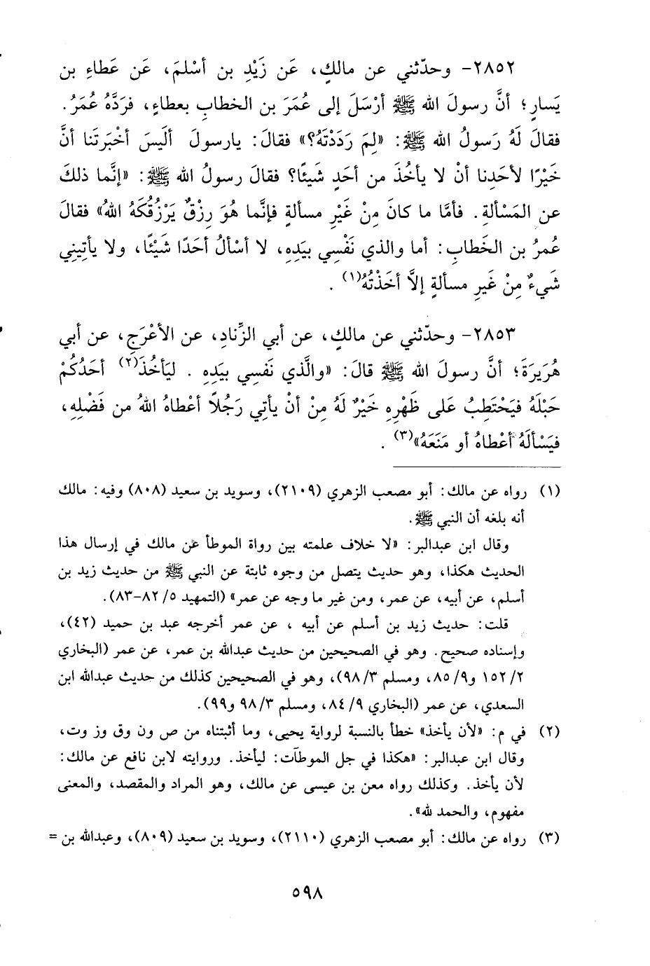 2852 - وَحَدَّثَنِي عَنْ مَالِكٍ، عَنْ زَيْدِ بْنِ أَسْلَمَ، عَنْ عَطَاءِ بْنِ يَسَارٍ، أَنَّ رَسُولَ اللهِ صَلى الله عَلَيهِ وَسَلمَ أَرْسَلَ إِلَى عُمَرَ بْنِ الْخَطَّابِ بِعَطَاءٍ، فَرَدَّهُ عُمَرُ، فَقَالَ لَهُ رَسُولُ اللهِ صَلى الله عَلَيهِ وَسَلمَ: لِمَ رَدَدْتَهُ؟ فَقَالَ: يَا رَسُولَ اللهِ، أَلَيْسَ أَخْبَرْتَنَا أَنَّ خَيْرًا لأَحَدِنَا أَنْ لاَ يَأْخُذَ مِنْ أَحَدٍ شَيْئًا؟ فَقَالَ رَسُولُ اللهِ صَلى الله عَلَيهِ وَسَلمَ: إِنَّمَا ذَلِكَ عَنِ الْمَسْأَلَةِ، فَأَمَّا مَا كَانَ مِنْ غَيْرِ مَسْأَلَةٍ، فَإِنَّمَا هُوَ رِزْقٌ يَرْزُقُكَهُ اللهُ، فَقَالَ عُمَرُ بْنُ الْخَطَّابِ: أَمَا وَالَّذِي نَفْسِي بِيَدِهِ، لاَ أَسْأَلُ أَحَدًا شَيْئًا، وَلاَ يَأْتِينِي شَيْءٌ مِنْ غَيْرِ مَسْأَلَةٍ إِلاَّ أَخَذْتُهُ.