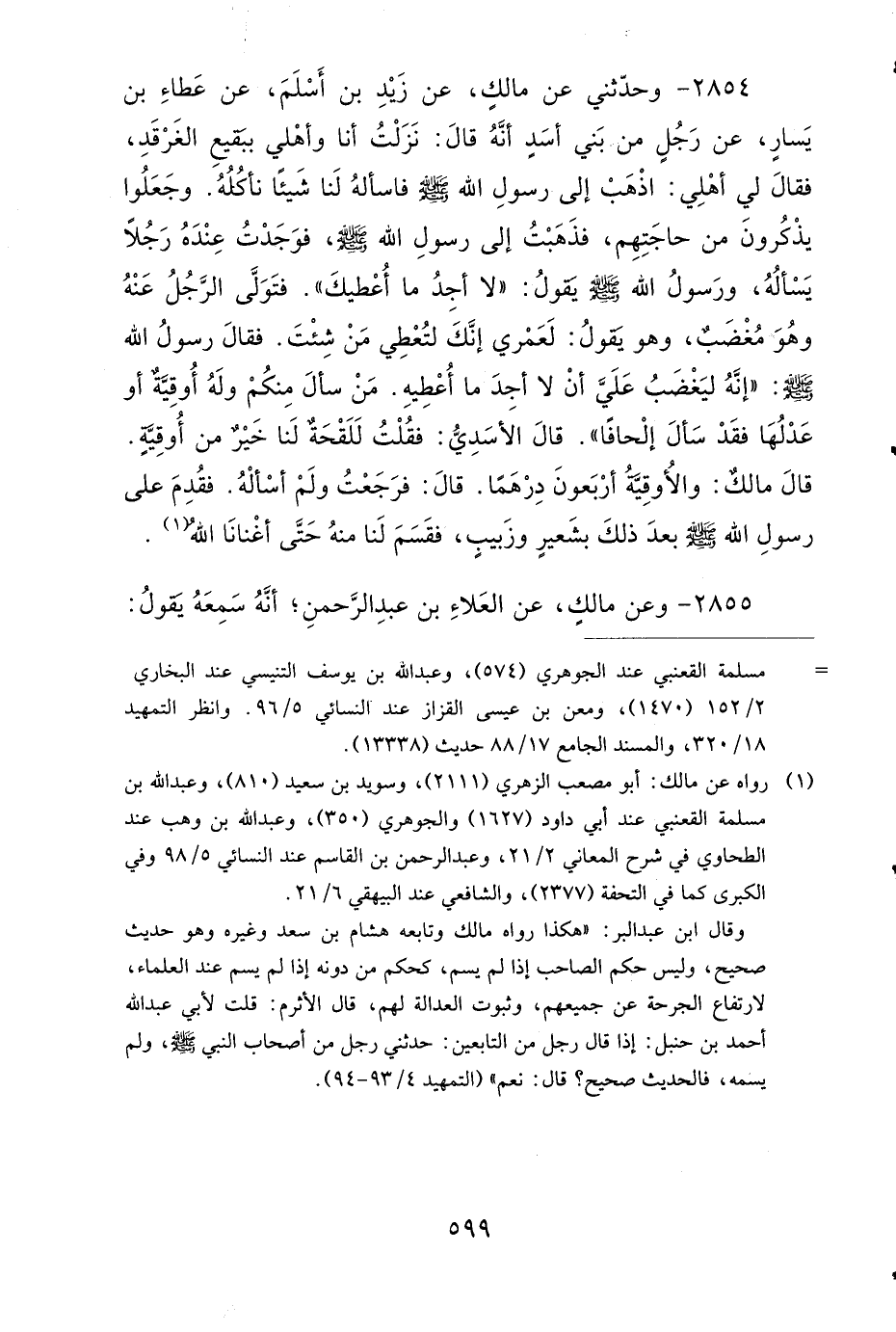 2854 - وَحَدَّثَنِي عَنْ مَالِكٌ، عَنْ زَيْدِ بْنِ أَسْلَمَ، عَنْ عَطَاءِ بْنِ يَسَارٍ، عَنْ رَجُلٍ مِنْ بَنِي أَسَدٍ، أَنَّهُ قَالَ: نَزَلْتُ أَنَا وَأَهْلِي بِبَقِيعِ الْغَرْقَدِ، فَقَالَ لِي أَهْلِي: اذْهَبْ إِلَى رَسُولِ اللهِ صَلى الله عَلَيهِ وَسَلمَ فَاسْأَلْهُ لَنَا شَيْئًا نَأْكُلُهُ، وَجَعَلُوا يَذْكُرُونَ مِنْ حَاجَتِهِمْ، فَذَهَبْتُ إِلَى رَسُولِ اللهِ صَلى الله عَلَيهِ وَسَلمَ، فَوَجَدْتُ عِنْدَهُ رَجُلاً يَسْأَلُهُ، وَرَسُولُ اللهِ صَلى الله عَلَيهِ وَسَلمَ يَقُولُ: لاَ أَجِدُ مَا أُعْطِيكَ، فَتَوَلَّى الرَّجُلُ عَنْهُ وَهُوَ مُغْضَبٌ، وَهُوَ يَقُولُ: لَعَمْرِي إِنَّكَ لَتُعْطِي مَنْ شِئْتَ، فَقَالَ رَسُولُ اللهِ صَلى الله عَلَيهِ وَسَلمَ: إِنَّهُ لَيَغْضَبُ عَلَيَّ أَنْ لاَ أَجِدَ مَا أُعْطِيهِ، مَنْ سَأَلَ مِنْكُمْ وَلَهُ أُوقِيَّةٌ أَوْ عَدْلُهَا، فَقَدْ سَأَلَ إِلْحَافًا، قَالَ الأَسَدِيُّ: فَقُلْتُ: لَلَقْحَةٌ لَنَا خَيْرٌ مِنْ أُوقِيَّةٍ.