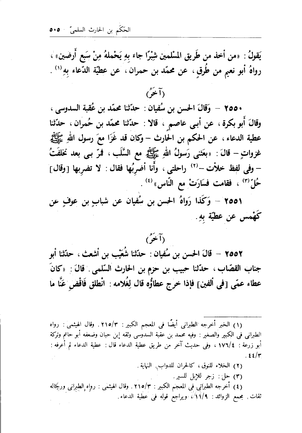2550 - وقال الحسن بن سفيان: حدثنا محمد بن عقبة السدوسي، وقال أبو بكرة، عن أبي عاصم، قالا: حدثنا محمد بن حُمران، حدثنا عطية الدعاء، عن الحكم بن الحارث - وكان قد غزا مع رسول الله - صلى الله عليه وسلم - غزواتٍ - قال: (بعثني رسول الله - صلى الله عليه وسلم - مع السلب، فمر بي بعد تخلفت - وفي لفظ خلأت - (¬1) راحلتي، وأنا أضربُها فقال: لا تضربها [وقال] حُلّ (¬2) ، فقامت فسارات مع الناس) (¬3) .