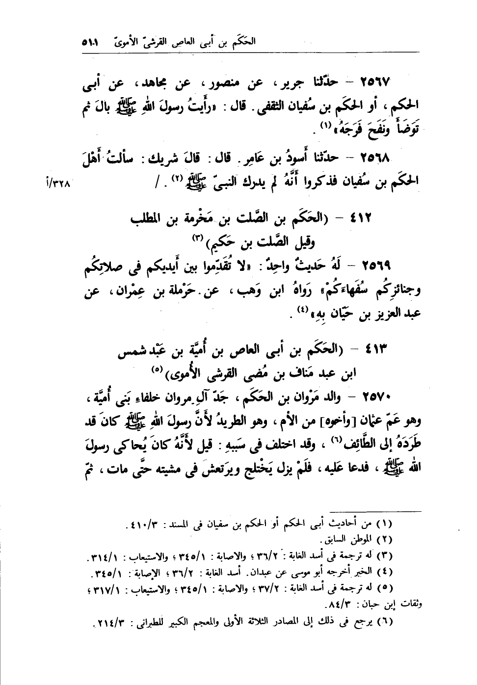 2570 - والد مروان بن الحكم، جد آلِ مروان خلفاء بني أُمية، وهو عم عثمان [وأخوه] من الأم، وهو الطريدُ لأنَّ رسول الله - صلى الله عليه وسلم - كان قد طردهُ إلى الطائف (¬6) ، وقد اختلف في سببه: قيل لأنهُ كان يُحاكي رسول الله - صلى الله عليه وسلم -، فدعا عليه، فلم يزل يختلج ويرتعش في مشيته حتى مات، ثم